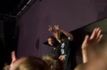 Er zijn twee mensen in de zaal die er vanaf het begin al helemaal in zitten: Vjeze Fur en Bas Bron. Freddy met zijn uiterst slicke R&B-zang in tracks als Bewuste Sabotage, een track waarin hij hier alle aandacht opeist. Bron staat op “Ja Natúúrlijk!” centraler dan ooit, met waanzinnige synth-producties als in Het Mysterie Van de Koude Schouder en natuurlijk Een Barkie, waarin Bron zich mag laten gaan in lange solo’s. Vanaf Een Barkie is de Pandora om, al dan niet door de bekertjes wodka die vooraf worden uitgedeeld – natuurlijk niet aan de kinderen. En ook niet aan uw verslaggever van dienst, die overigens wel een andere keer is dronken gevoerd door Vjeze Fur, maar dat geheel terzijde.