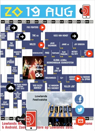 Het Lowlands programmaboekje, met daarin het overzicht van artiesten en het blokkenschema, bevat dit jaar een heleboel extra informatie die je op het eerste gezicht niet ziet. Met behulp van smartphone of tablet is met de Layar app de 3voor12 layar tevoorschijn te toveren, met daarin een heleboel Lowlands concerten, interviews en recensies.