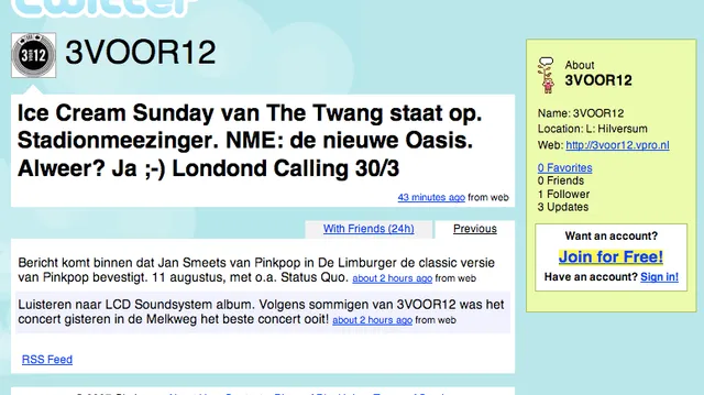 3VOOR12 schrijft zijn verhalen kort en lang op de site en dat blijft zo. We gaat ervan uit dat jullie dat ook blijven doen in wiki, weblog en forum. Maar er is een ander soort informatie uitwisseling waar 3VOOR12 geen ruimte voor heeft. De oneliners, de korte invallen, het kijkje in de keuken. Dus in de 3VOOR12 Twitter-stroom ga je lezen waar we warm voor lopen, welk kort bericht binnenkomt, of misschien wel rechtstreekse berichten van concerten. We zien het. We gaan kijken. Wordt het niks, dan wordt het niks.