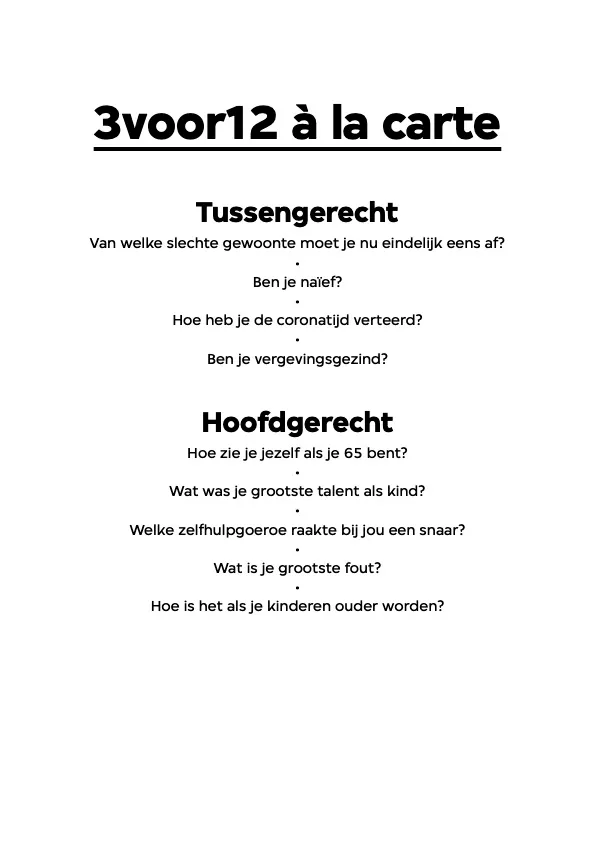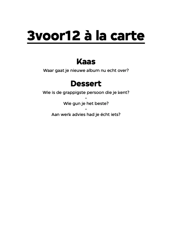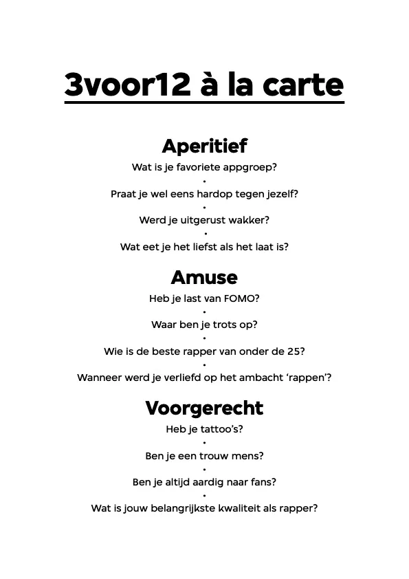 Je hebt interviews in hotels, in cafés, bij iemand thuis, online via een scherm, maar in de sportschool? Dat is een first. Om eerlijk te zijn was Fresku zijn afspraak een klein beetje vergeten, maar zijn vrouw en beschermengel Lieke is alert en rijdt me naar de plek aan de rand van de stad Eindhoven waar de rapper zich net een uurtje leeg getraind heeft. Samen met zijn creatieve compagnon Teemong, die er een sport van maakt zo lang mogelijk als introducé mee te gllippen. ‘Ik moet nog benen doen’, zegt Fresku. ‘Dat doe ik altijd als laatste, maar iets in mij is blij dat ik dat niet meer haalde. Nee, ik train niet speciaal voor de tour. Ik weet uit ervaring dat als ik zo'n concreet doel stel ik dat ook weer als een goede reden zie om na de tour te stoppen met sporten.’ Fresku schuift met een proteïneshake aan in het hoekje van het restaurant en krijgt de menukaart met vragen in zijn handen geduwd. Zeven gangen met vragen, uit elke gang een vraag.
