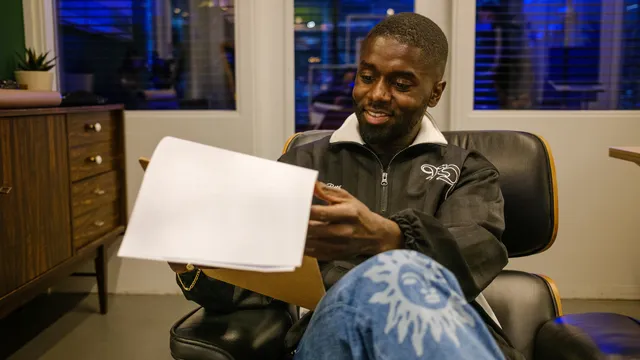 ‘Wauw. Ik... Hm. Haha. Ik... Hm. Dit is complex, bro. Ik twijfel tussen de eerste en de laatste vraag. Ik ga kijken of ik ze misschien kan combineren. Oké, let's go. Toen ik heel jong was, was er in de Bijlmer nog een onbewustzijn van de verschillende etnische groepen die er waren, naar elkaar toe. Als Ghanees of als Afrikaans persoon stond je onderaan de ladder, onder de mensen uit oude Nederlandse koloniën, Suriname en de Antillen. “Jullie hebben je eigen kerk. Jullie kleden je altijd zo raar op die zondagen. Jullie ouders spreken geen Nederlands. Jullie zijn arm. En jullie eten altijd rare gerechten.” Er waren zelfs kids die moesten liegen dat ze niet Ghanees waren, om maar niet gepest te worden. Dat was heel pijnlijk om te ervaren. Terwijl ik al heel vroeg wist: we zijn gewoon één.’
