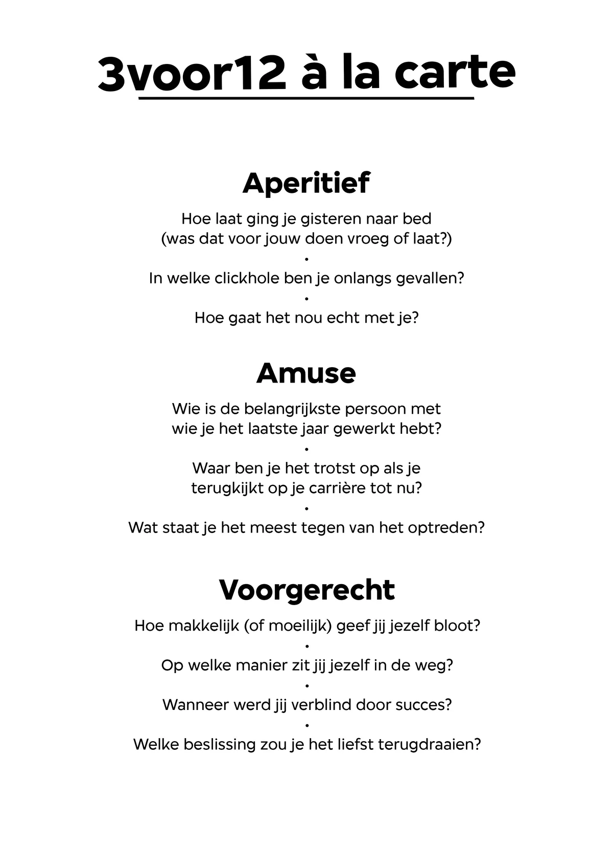 ‘Een clickhole hoeft niet per se negatief te zijn, toch? Ik ben in Julian Schnabel gedoken, dat is een kunstenaar van de generatie van Basquiat en Andy Warhol. Hij heeft een film over Basquiat gemaakt waarin Andy Warhol gespeeld wordt door David Bowie. Ik vond een interview met Bowie en Schnabel, kende hem niet, dacht dat hij gewoon de regisseur was, ging checken wie hij was en ben op YouTube in zijn werk gedoken. Hij blijkt een verdienstelijk kunstenaar te zijn in his own right. Hij is bekend geworden doordat hij kopjes en schoteltjes kapot gooide, tegen het canvas plakte en daar dan weer portretten overheen maakt. Ik kan daar zo een week in duiken, dan gaat mijn eigen creativiteit ook borrelen. Daardoor ging ik gisteren te laat naar bed, maar gaat het wel goed met me! Kijk, heb ik alledrie de aperitief-vragen afgevinkt!’