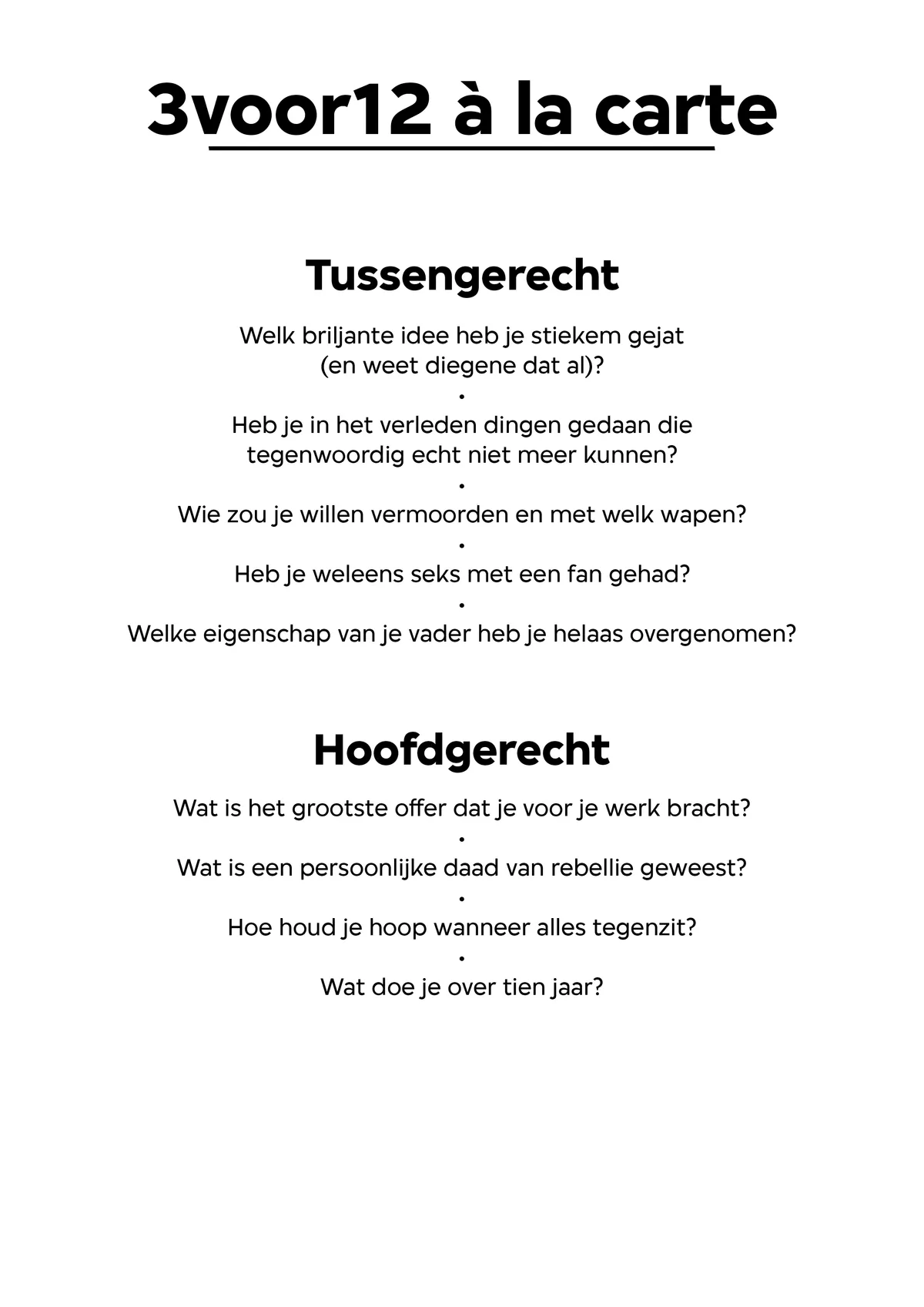 Hij begint te lachen terwijl hij de menukaart bekijkt: ‘Heb je het menu zo opgebouwd dat ze steeds meer naar je keel grijpen? Nou… Ik zit mezelf in de weg als ik mezelf laat leiden door emotie. Als artiest en als maker kan dat voor je werken: je kan vol in de emotie gaan zitten en van daaruit maken. Maar ik kon er weken in blijven hangen, en in het leven kan dat heel vervelend zijn. Nu lukt het me steeds beter om die emoties wel te gebruiken, maar ook mijn verstand blijven gebruiken.’