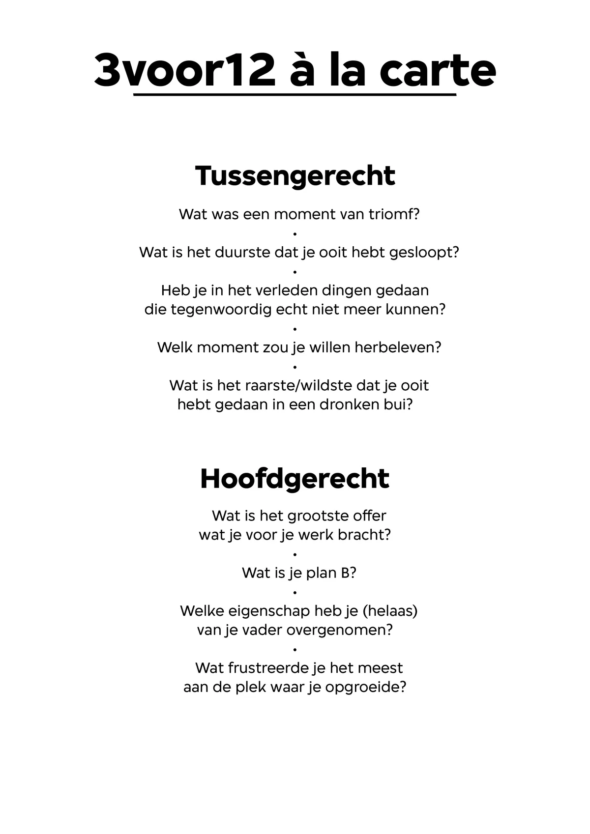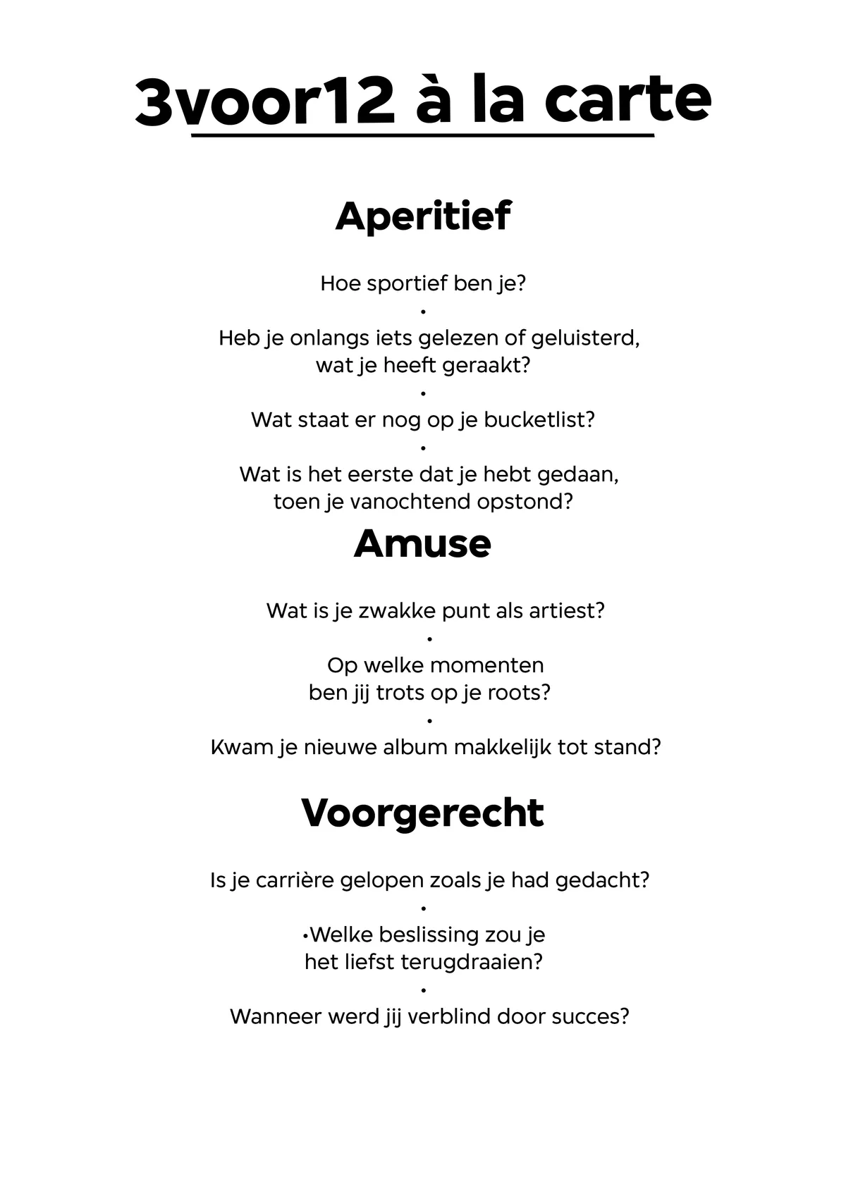 ‘Je wilt een smeuïg verhaal? Ja, dat vind ik altijd zo moeilijk. Want zoveel dingen heb ik niet. Of tenminste… geen dingen die geschikt zijn voor een 3voor12 A La Carte.’ Hij begint bulderend te lachen. ‘Ik heb tegenwoordig ook kinderen, hè? Die komen straks naar me toe: “Papa, wat is dit nou weer?!”’