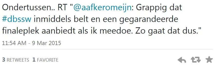 Een tweet van Aafke Romeijn veroorzaakte gisteren nogal wat reuring: was de zangeres telefonisch een finaleplek gegarandeerd als ze mee zou doen aan De Beste Singer-Songwriter? Van schrik verwijderde ze de tweet, want ze had niet verwacht dat die zoveel aandacht zou genereren. “Misschien is het naïef, maar ik was in de veronderstelling dat iedereen wel wist dat dit zo gebeurde.” Giel ontkende vanochtend op de radio en zei dat het om een mailwisseling ging en geen telefoontje. Volgens Romeijn heeft die mailwisseling inderdaad plaatsgevonden, “maar dat is niet de info waarover ik het heb”.