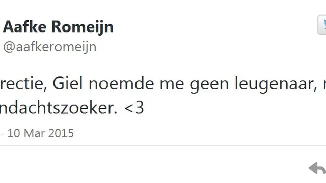 Giel was eigenlijk niet van plan te reageren, vertelde hij vanochtend op de radio (fragment begint rond 29:30). “Ik zie nu een sms’je binnenkomen: hoe zit het met dat Aafke Romeijn-verhaal? Ik was eigenlijk geneigd om niet te reageren, want als mensen op die manier om aandacht vragen, dan kun je dat beter niet doen. Maar ik ben nu toch al bezig dus kan het wel even kort vertellen. Aafke Romeijn beweerde heel kort op Twitter – snel daarna trok ze haar keutel weer in – dat ze in de finale van De Beste Singer-Songwriter zou komen als ze mee zou doen. Nou, daardoor was ik natuurlijk onaangenaam verrast, want ik wist daar niets van.”