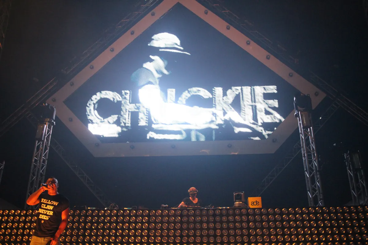 Glowinthedark laat uitstekend de roots van Dirty Dutch horen: harde bubbling beats, opgewaardeerd met wat house, af en toe een hiphoptrack. Het gaat van Kanye West's Mercy (in de Grime & Salva remix) tot Adele in de Moto Blanco mix tot klassieker I Like To Move It van Reel 2 Real, van openlijk catchy tot behoorlijk edgy. Dat werkt, ook in een massieve hal als Ziggo Dome, die zich bewijst als een perfecte plek voor dit soort grote dance events. De ijzeren podiummasten die aan het plafond hangen lichten met een gele glans op tot een soort gouden kettingen. De tientallen discobollen worden voorzichtig aangeraakt door de eerste lichtstralen, en de man met de vuurwerkknop zit even na 1 uur klaar voor de soloset van Chuckie.