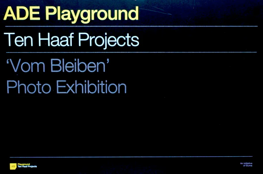 ADE biedt de bezoeker steeds meer vrijheid voor leuke off piste-routes. Zo loopt in hartje Jordaan bij galerie Ten Haaf Projects de foto-expositie Vom Bleiben, een serie die de magie vastlegt van een leeg interieur net na afloop van een technofeestje. Het buitenlandse debuut van het duo Giesemann en Schwarz stimuleert de ogen tot de kunst van het kijken naar steriele smoezelige zalen.