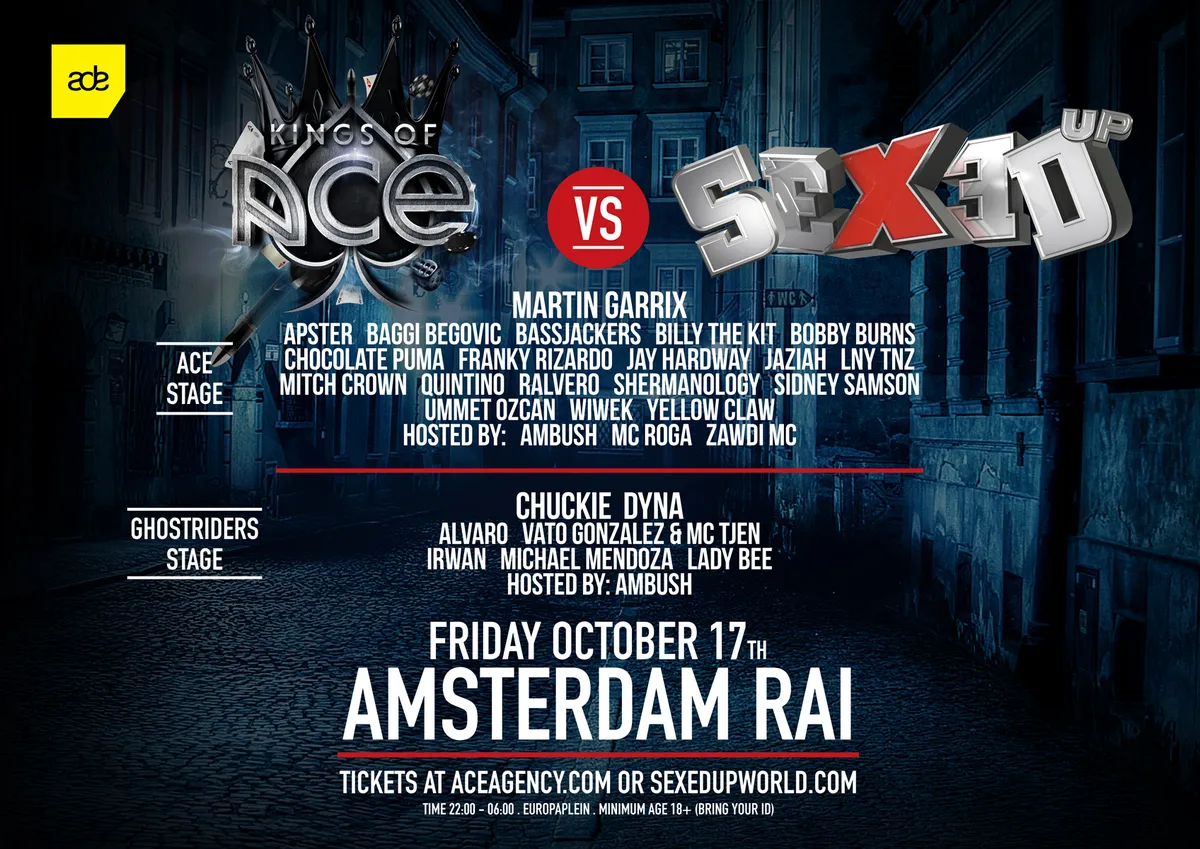 Inmiddels is er een oplossing gevonden voor de twee ADE-feesten die in The Sand zouden plaatsvinden: Kings of Ace en Sexed Up worden samengevoegd en zullen 17 oktober tegelijk plaatsvinden in de Amsterdam RAI. Daarmee is de RAI dit jaar toch weer een locatie - in tegenstelling tot voorgaande jaren stonden er tot nu toe geen ADE-feesten gepland. “Het worden twee area’s met één ingang”, vertelt de event manager van Sexed Up. Een al aangeschaft kaartje voor Sexed Up ofwel Kings Of Ace geeft nu dus toegang tot beide feesten.