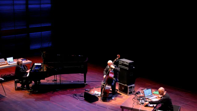 Laten we elkaar geen mietje noemen. Een house dj/producer die gaat samenwerken met een jazzpianist klinkt als een vreselijk slecht idee. Tel daar nog eens een bassist bij die zo nu en dan zijn instrument laat huilen als een Jiddische klarinet en je hebt alle reden om er zo hard mogelijk bij weg te sprinten met je vingers in de oren. Vanavond blijkt in het Muziekgebouw Aan't IJ dat het ook goed kan uitpakken.