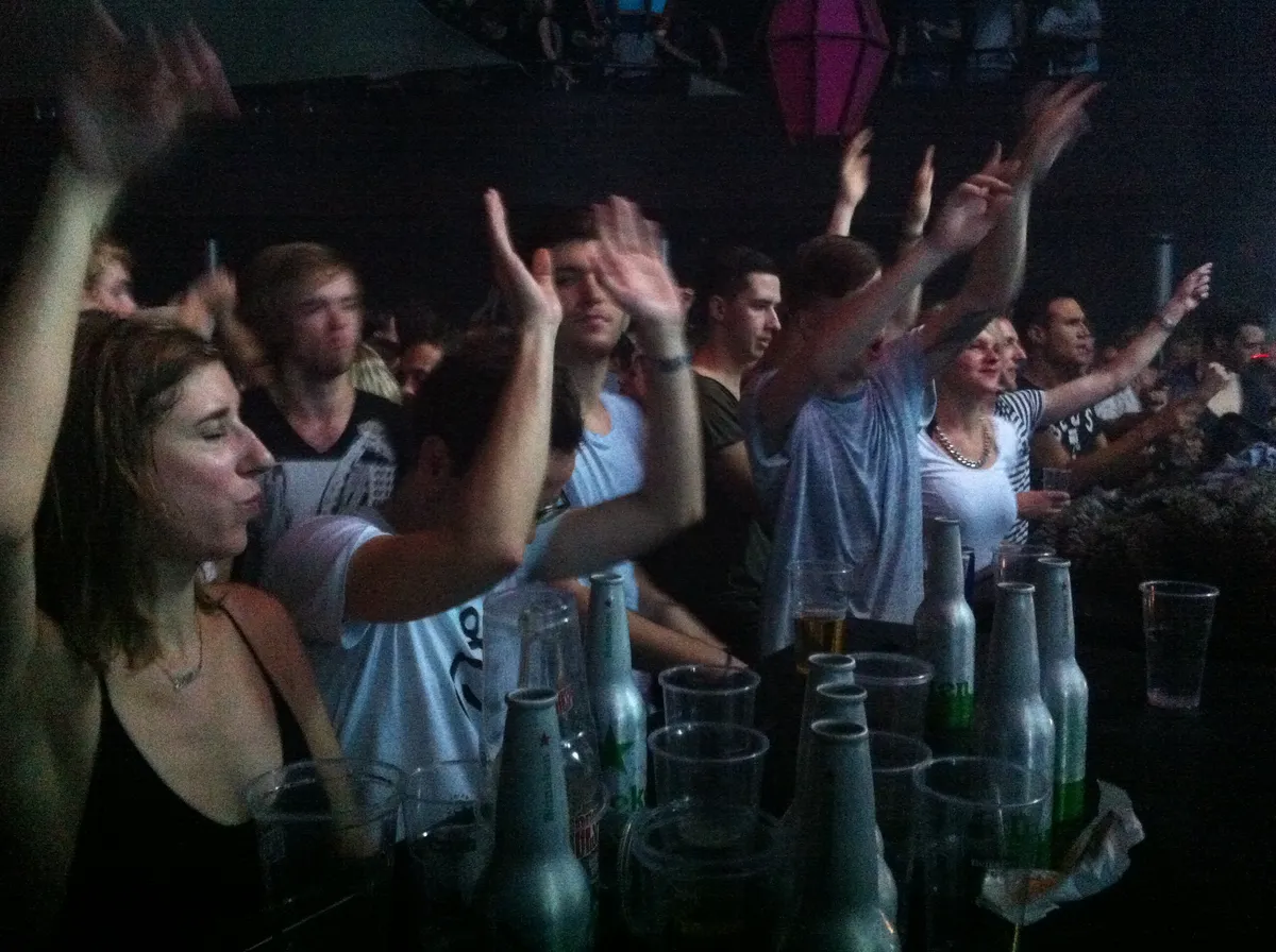 Robag Wruhme neemt een slok van zijn witte wijn en kijkt naar een steeds voller wordende Marktkantine. DJ Koze en Axel Boman vergezellen hem bij de trage openingsset. De diepe bassen brengen het publiek tot bedaren. De rode lichtzuilen op het podium maken dat we vanavond een haast kerkelijke ervaring beleven, die nog versterkt wordt door het ‘got to believe something’ dat uit de speakers klinkt. Hoogtepunt in de set is een mysterieus, doch sexy ibizatechno plaat.