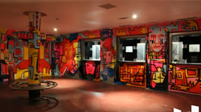 De felgekleurde en vrolijke entree is onder handen genomen door kunstenaar Narouz, die zijn stempel op het hele interieur mocht drukken. Via een trap komen we boven, waar we het grote balkon betreden. Het rode tapijt met barokpatroon verraadt dat het hier om een locatie met geschiedenis gaat. Die combinatie van oud en nieuw werkt. Terwijl we uitkijken op de dansende menigte onder ons vertelt Paul over de start van de Marktkantine, als after van Voltt-festival. Sindsdien is er een handjevol events geweest maar met ADE wil de Marktkantine bekend worden bij het grote publiek. Niet alleen van afters en dance, maar ook voor andere activiteiten zoals tweedehands kledingmarkten. “Mijn moeder moet hier op zo’n markt kunnen komen, en niet het gevoel hebben dat ze in een club is geweest. Het is een veelzijdig gebouw dat we aan kunnen passen aan event en publiek.”