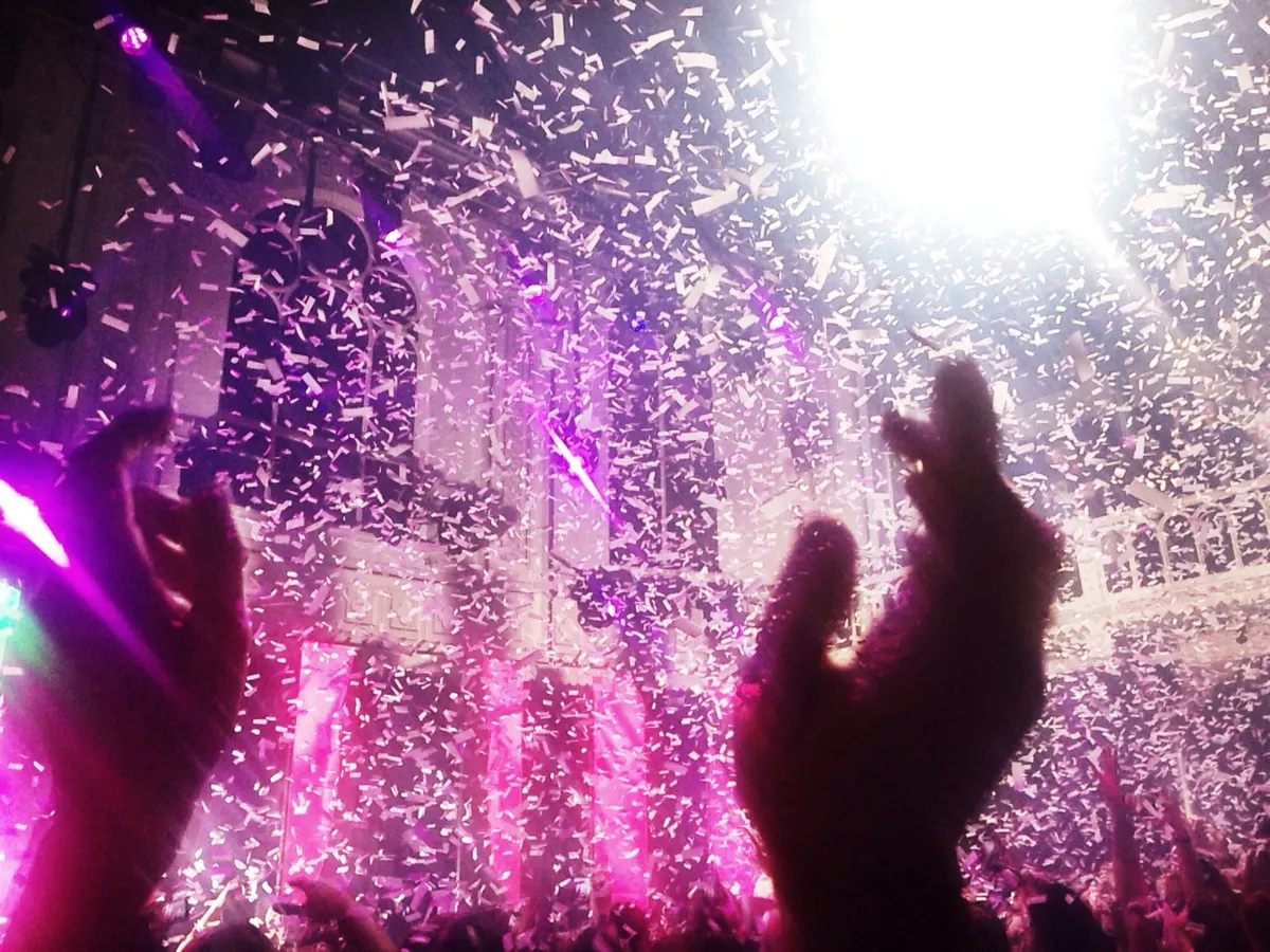 Oliver Heldens begint met confetti, en het publiek gaat automatisch in hos/heeeehooo-modus.