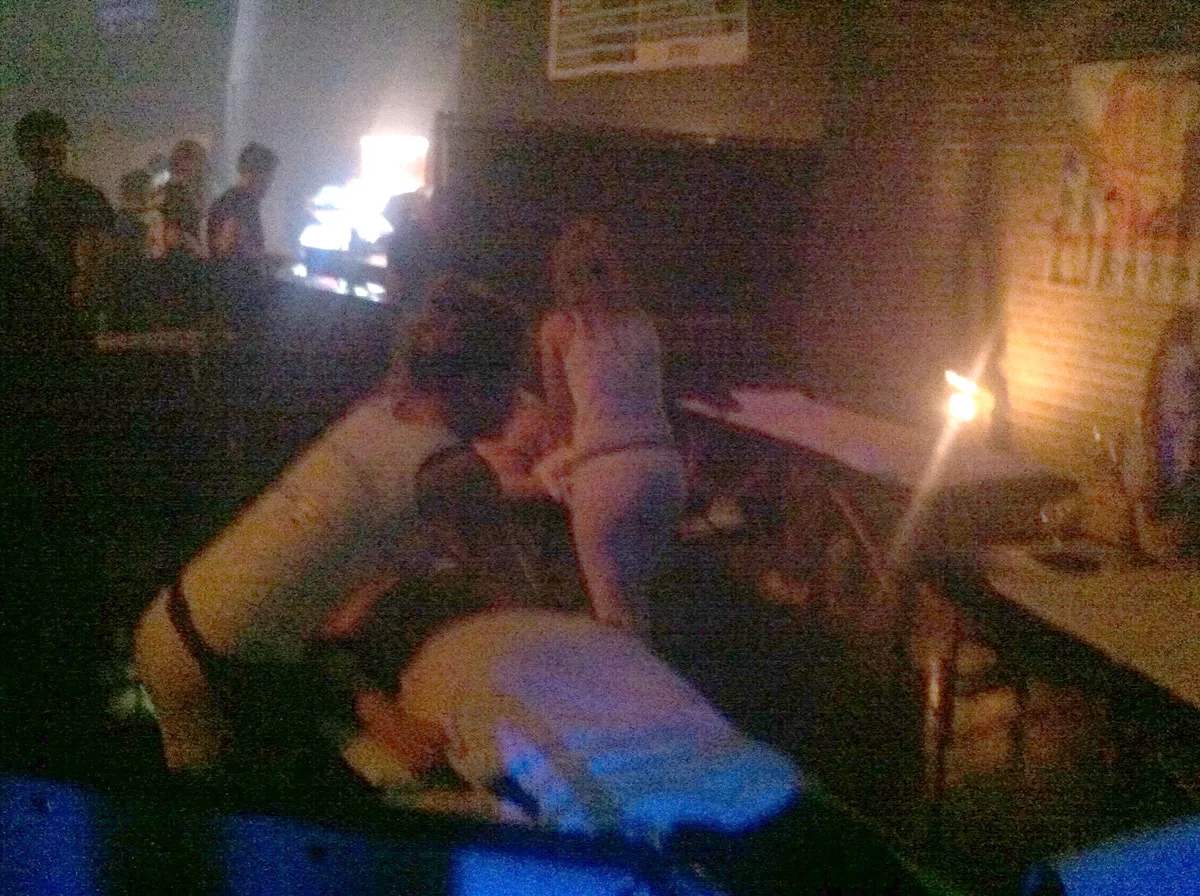 Hallo Syrië, na een half uur noisy underground techno gooit Nobu het ineens open met een hysterische track. Hij danst erbij, schokkerig soepel. Eeeeen terug naar de techno. Nog één blik op de discobal. Ik lever mijn passe-partout voor de stad Amsterdam weer in. Eigenlijk is het toch veel leuker dan festivals he, die donkere clubs. (Atze de Vrieze)