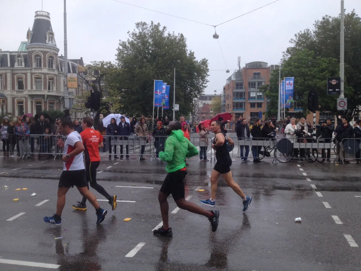 Terwijl er nog in verschillende clubs geafterd kan worden hebben de iconische zwart-gele vlaggen vanochtend plaats gemaakt voor die van de Marathon van Amsterdam. (Robbie van Zoggel)