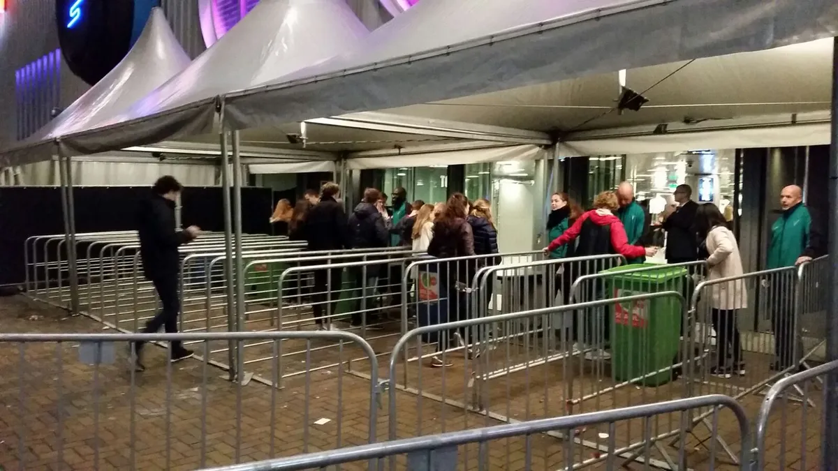 De controles bij de ingang zijn deze ADE overal bijzonder streng. Zelfs bij vrijplaats OT301 staat de vaste doorman met zichtbare tegenzin door portemonnees te graven en te fouilleren. Als mijn oude krakersvrienden me maar niet zo zien, lijkt hij te denken. (Sjoerd Huismans)