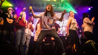 Cairo Liberation Front dj Yannick Verhoeven is 26 geworden vandaag. MC Joep Schmitz haalt de champagne erbij, spuit over hem heen. Confettikanonnen gaan af. Het publiek zingt Happy Birthday. Joep: "Nu is het podium glad. 2 jaar geleden brak ik zo m'n been. Daar gaan we vanavond weer voor!"