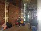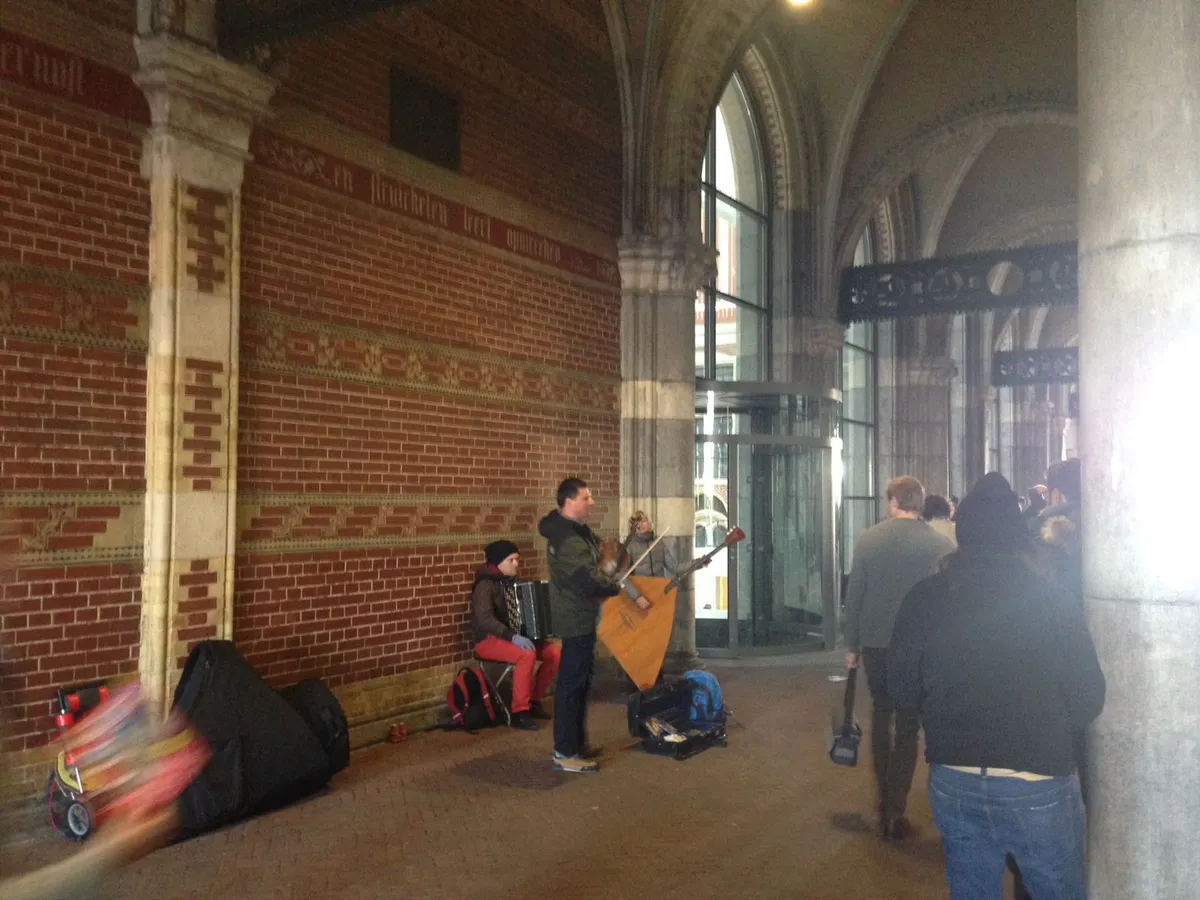 Waar gisteren Maceo Plex stond te draaien, is nu het vaste straatmuzikanten-trio alweer de Vier Jaargetijden aan het spelen.
