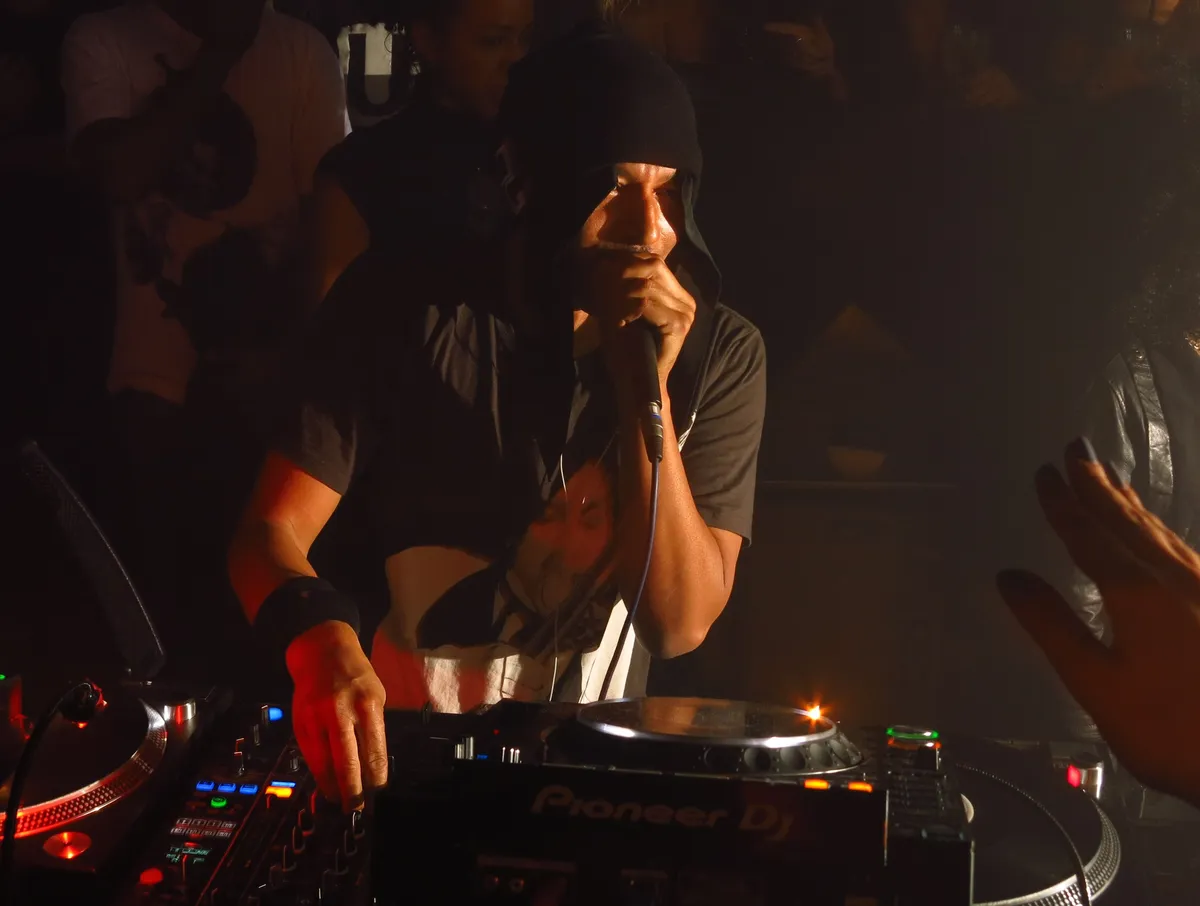 Een technisch begaafd dj zal Moodymann nooit worden. Hij mixt slordig en abrupt en lijkt daar totaal niet mee te zitten. In plaats van een fatsoenlijke koptelefoon gebruikt hij i-Phonedopjes die permanent onder een grote muts in zijn oren hangen. Nee, bij een dj-set van Moodymann gaat het vooral om het wijdlopige verhaal. Dat langs klassiekers van Jimi Hendrix en de Doobie Brothers loopt maar net zo makkelijk terugveert naar MK’s Burning uit 1992 of met violen overladen disco van BT Express.