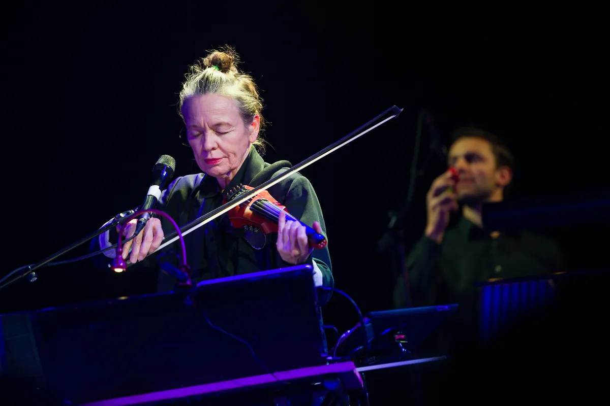 De Rabozaal is een prima alternatief voor het Concertgebouw en Muziekgebouw aan het IJ, prachtige locaties waar ADE afgelopen jaren al soortgelijke concerten programmeerde. En wat een voorbeeldig publiek, een mix van hardcore klassieke muziekfans en de incrowd van de Amsterdamse cultuursector. Echt niemand durft het aan verveeld met zijn smartphone te spelen of delen van het concert te filmen. Naast me zit Jan uit Tsjechië. Hij is hier met zijn vriendin en heeft ook zijn binoculair mee. Het concert is een cadeau voor zijn verjaardag en geeft toe dat hij zelf geen kaartje gekocht zou hebben. Maar als we even doorpraten wordt duidelijk dat hij toch wel een echte Laurie Anderson watcher is, zonder twijfel de jongste (27) van iedereen in de zaal.