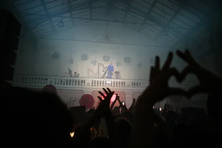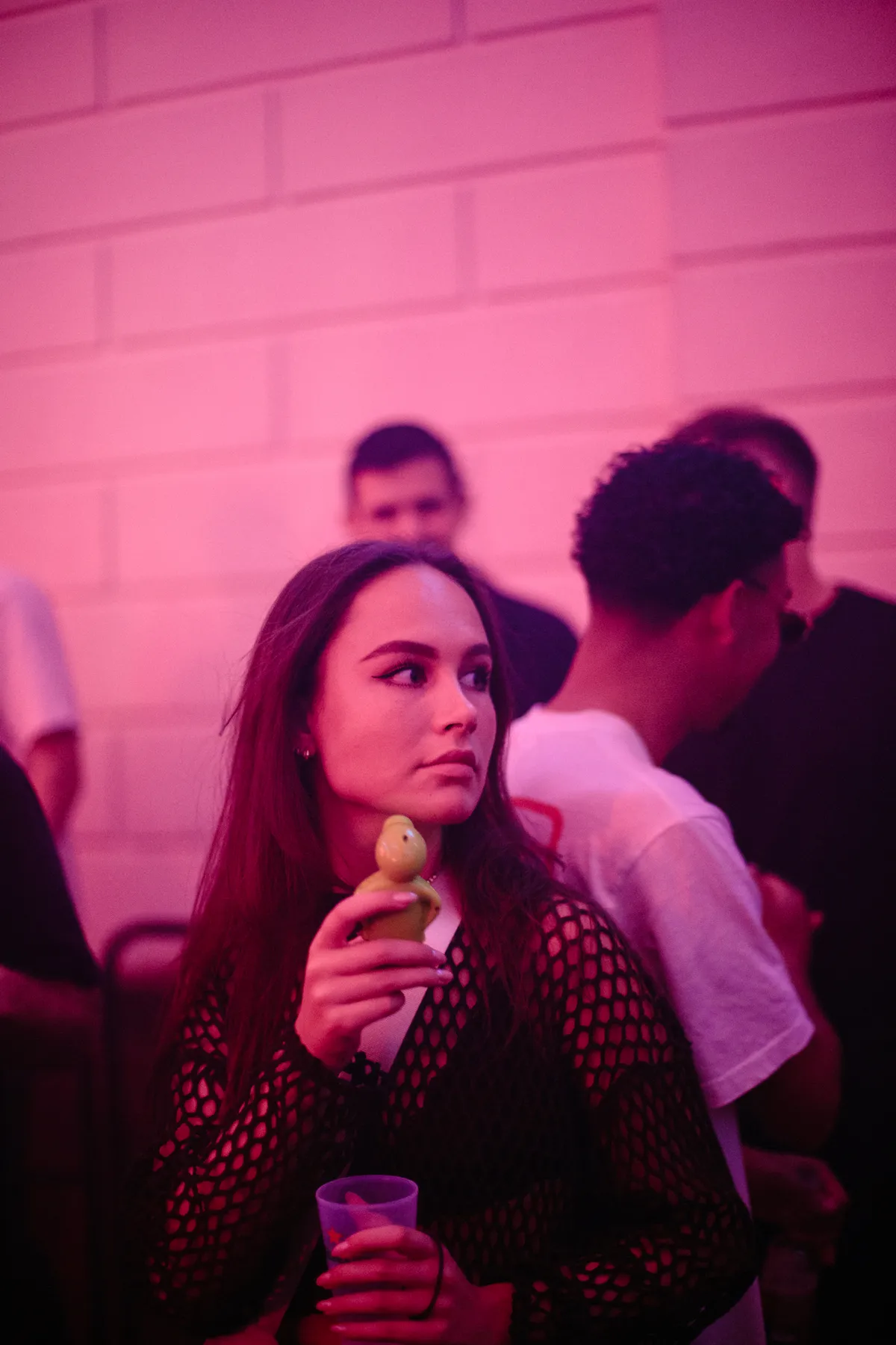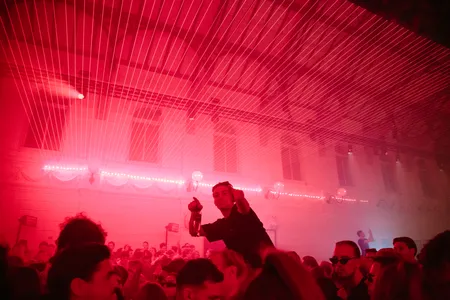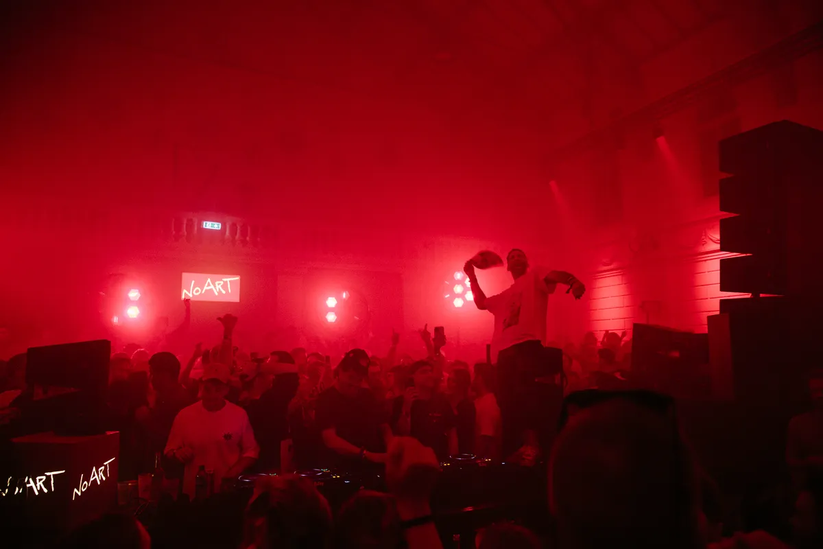 En dan gebeurt er iets geks. Opeens wordt het feest stilgelegd, en verschijnt daar op het balkon een harpist. Verdomd, dat is Remy van Kesteren die acht minuten lang wonderlijke arpeggio’s uit zijn snaren plukt. In eerste instantie brengt hij de manege in vervoering, maar het moment duurt nét effe te lang. Het past wel totaal in de filosofie van Anotr en hun feest No Art: af en toe een klein artistiek verrassinkje om het publiek een speldenprikje te geven. In Paradiso organiseerden ze al eens een ademhalingssessie (kennelijk barstte menig raver er in tranen uit?!), ze hebben ook weleens een dichter in de club neergezet en dan is er nog het weirde verhaal over de performance kunstenaar die op de dansvloer begon te pissen…