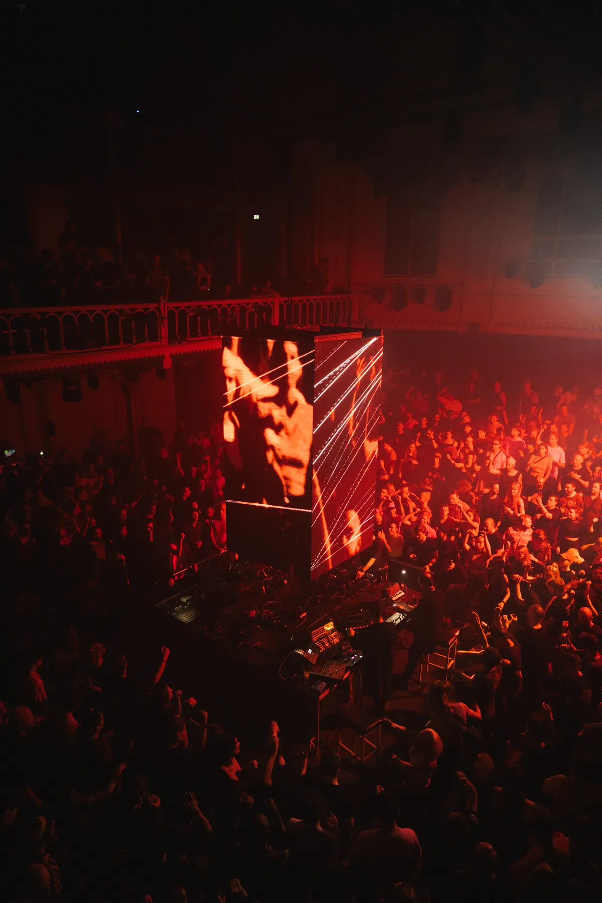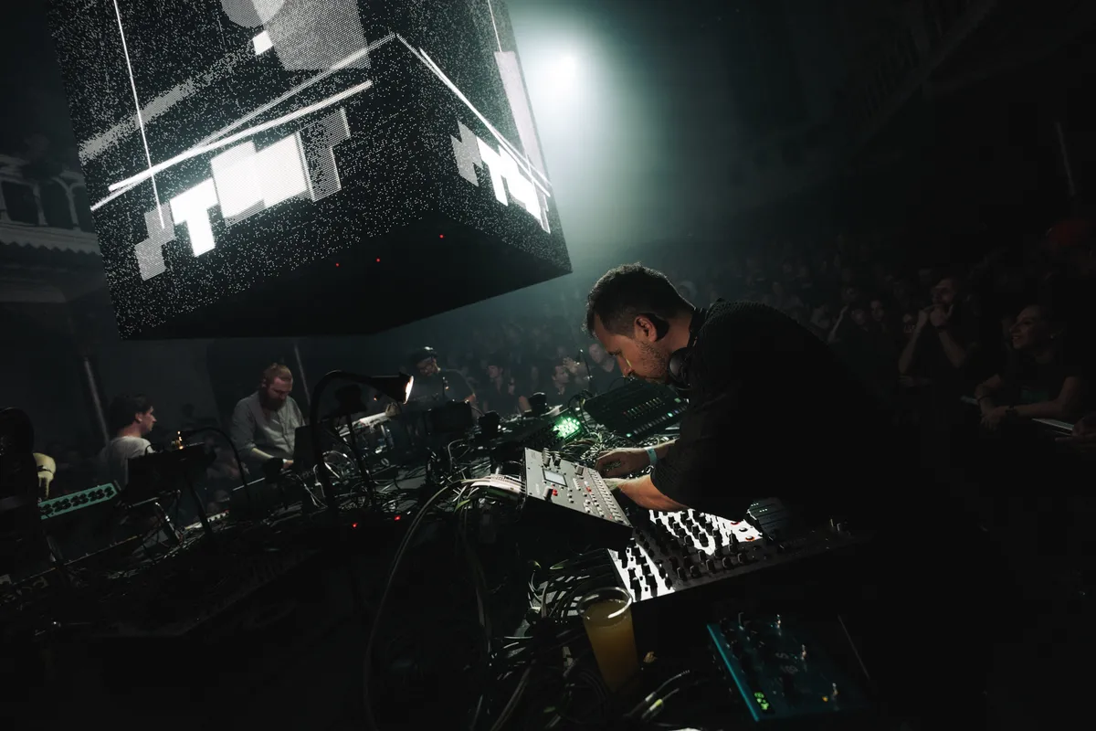 Nee, de focus ligt volledig in de grote zaal, bij Speedy J, Vril en Rødhåd, bij Donato Dozzy en Neel. Ze staan onder een gigantische projectiezuil in het midden, voor hun neuzen een gigantische kluwen aan synthesizers, van keyboards tot draadbakken, samplers en sequencers verlicht door IKEA-lampjes. De twee duo’s trekken daar continu nieuwe geluiden uit. Drums. Bassen. Melodieën. Hier en daar een gek sampletje. De input komt terecht bij regisseur Speedy J, die de 909-drumcomputer bedient en ook de dynamiek beheert met zijn mixer. Daar kun je in 360˚ om de booth met je neus bovenop staan, maar het is net zo leuk om een uurtje naar boven te gaan, over de balustrade naar beneden te turen en een raadspelletje te spelen: wie is waar eigenlijk mee bezig?!