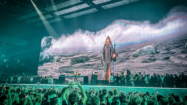 Anyma heeft virale kwaliteiten, weten zij. Natuurlijk ligt dat aan de larger than life EDM-techno. Muziek vol mega-contrasten. In tracks als ‘Exodus’ valt het helemaal stil, dan trekt-ie met epische trance-akkoorden aan de gevoeligste snaren voordat de bombastische drop valt. Zijn muziek zit ook vol pop-remixes: in anderhalf uur horen we The Weeknd, Underworld, Playboi Carti, zijn top-remix van Fred again.. en Swedish House Mafia, en natuurlijk de stem van Grimes, Milleri's nieuwe levenspartner. Met haar deelt-ie de liefde voor groteske sci-fi-beeldtaal, en dat is die tweede virale kwaliteit van Anyma. Op het scherm lopen tienduizenden boselfen en cyborgs op weg richting wereldvrede. Een robot die engelenvleugels groeit. Een futuristische hi-tech-stad vol groen. Iets over een utopische toekomst waarin technologie en natuur in perfecte balans komen, kennelijk. Ja, je begrijpt wel dat Anyma rond NYE de megalomane Sphere in Las Vegas gaat overnemen, en daarmee in de voetsporen treedt van U2.