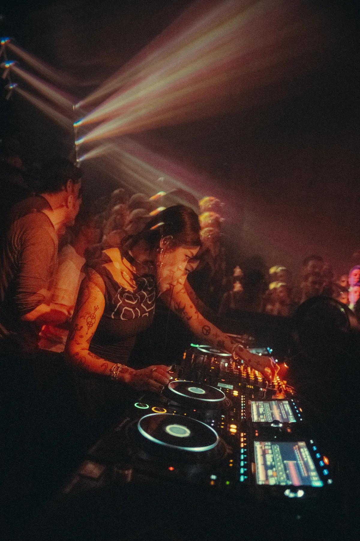 Wel leuk om te beseffen dat hier recht onder Berghain-resident Marcel Dettmann aan het draaien is. Dat doet hij samen met de Luxemburgse nieuweling Ogazón, een techno-dj die de laatste twee jaar overal opduikt (maar daarvoor al talloze keren bij Breakfast Club langs kwam). Dat heeft Breakfast Club trouwens uitstekend voor elkaar: de man-vrouwverhouding is volkomen gelijk. Vrijwel elke back-to-back bestaat uit een man en een vrouw, en ze zijn allemaal aan elkaar gewaagd. Ook nu weer is het mooi om over hun schouders mee te kijken, naar Ogazón die graait in haar vinyl-bak en Marcel die in zijn Rekordbox scrollt door het mapje 'playlist Nathalie & Marcel'. Nathalie (Ogazón dus) krijgt een knuffel van Dettmann als ze een percussieve technovlammer precies op het juiste moment weet te plaatsen om de tent op z'n kop te zetten. De lichtman heeft het ook begrepen en zet een langzaam strobe-effect in, zodat de zaal om de halve seconde even helwit verlicht wordt.