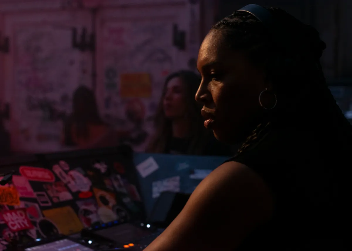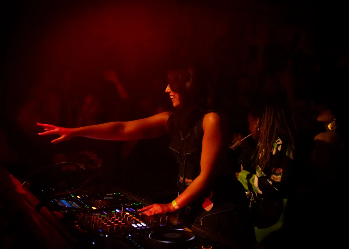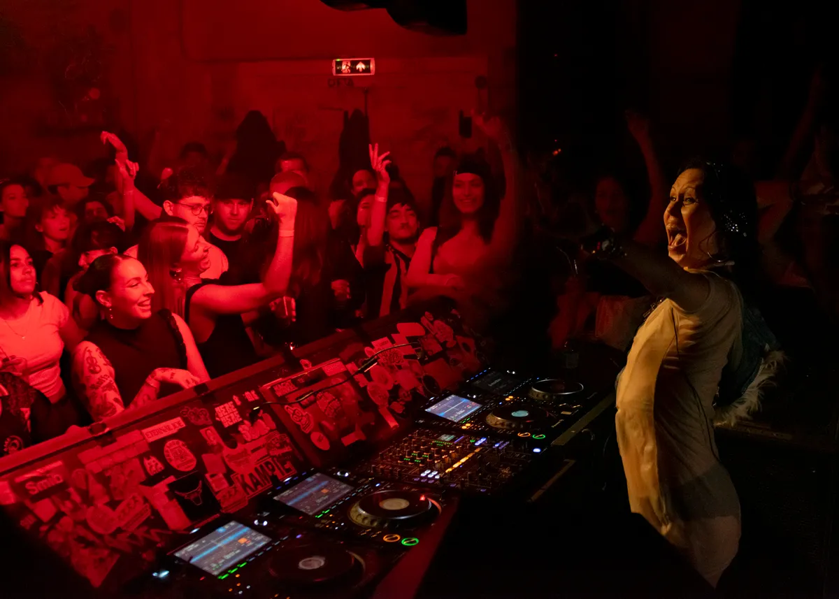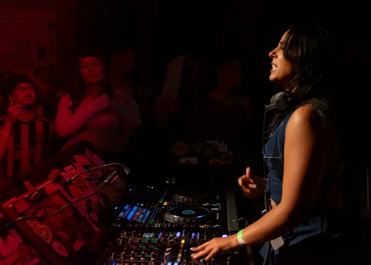 Voor de booth en op de voorste rij staan vooral BIPOC-vrouwen. Het is opvallend hoeveel van hen op Jyoty’s shows afkomen en hoe zichtbaar ze de energie van de avond dragen. “Het loont om fan van haar te zijn,” zegt een bezoeker buiten op een picknickbank. Veel van hen voelen zich gerepresenteerd door een vrouw die trots haar niet-westerse achtergrond laat zien en haar podium gebruikt voor Palestina en vrouwenrechten. Ze voelen zich veilig bij haar feesten en weten dat ze hier echt los kunnen gaan. Dat is geen toeval. Achter de schermen bouwt Jyoty actief aan haar community: een Discord voor solo-bezoekers, duidelijke huisregels op social media (“wees lief, laat de gekste dansers vooraan staan, drink genoeg water”) en een persoonlijk briefje bij de ingang waarin ze waarschuwt dat er wordt gefilmd.