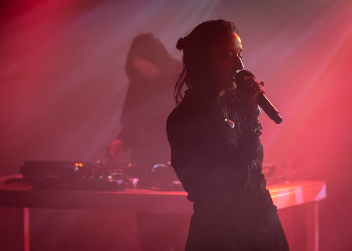 Het vierkoppige Fuuturejazz doet hun naam eer aan. Ontelbare jazzsamples worden uit elkaar getrokken en weer aan elkaar gelijmd. Terwijl ze met fluit, belletjes en gefluisterde vocals voor een extra laag zorgen: ieder in hun eigen bubbel. Soms klinkt even de houvast van een jazzy beat (die nog steeds klinkt alsof ‘ie zo uit een abstract Billy Woods-nummer is geplukt), om daarna weer te verdwijnen in het spirituele diepe van Sun Ra of Anthony Braxton. Flarden breakcore en harddrum flitsen door het rookgordijn, dat de rest van de avond niet meer optrekt (arme fotograaf). Susu Laroche, anagram voor Chaos Lure Us, dwaalt als een schim over het podium. De laconieke stem van de Egyptisch-Franse zangeres lost zowat op in de productie van Britse producer MOBBS, die de wazige artpop met z’n CDJs aan elkaar mixt. Het publiek kijkt spaced out toe. Van de headliner van vanavond, de Londense band Moin, hoeven we al helemaal niets te zien als het aan de rookmachines ligt. De sound van het trio is ergens te vinden tussen het ritmische van techno en de gruizige gitaren van een jaren negentig post-hardcoreband à la Slint.