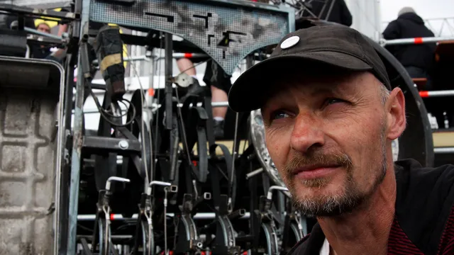"Ik ben Geert Jonkers en ik ben audiomachinst. Dat houdt in dat ik machines maak die veel takkeherrie maken, onder andere de kolossale machine die De Staat gebruikt. Ik kom eigenlijk uit de theaterwereld en ik reis met mijn theatergroep Odd Enjinears door West-Europa. Soms ben ik beeldend kunstenaar, soms performer en soms muzikant, een manusje van alles dus. Ik heb onlangs de grote machine speciaal voor de band gemaakt. Het is echt een mooie gadget. Als ik zelf speel ben ik afhankelijk van dit soort machines."