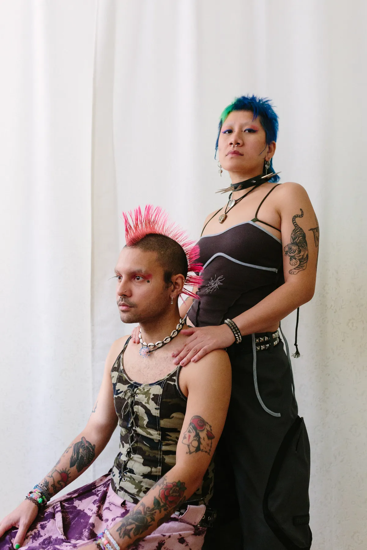 Dat is vaak nog best ingewikkeld, zeggen de twee. Lalihatu: ‘Mijn moeder, die wit is, wilde altijd dat ik er heel netjes en verzorgd uitzag. Ik heb altijd bonje met mijn moeder gehad over zulke dingen, het was nooit goed, of ik nou lang haar of kort haar had.’ Luu: ‘Ik ben blij hoe vrij en begrepen we ons voelen in onze vriendengroep, onze chosen family. Bij mijn ouders is het nog ingewikkeld, het gaat traag. Mijn haar, mijn tatoeages, mijn neuspiercing, dat vinden ze allemaal maar vreemd. En in principe zijn ze zelf best chill, maar zijn ze bang wat andere familieleden ervan vinden. Ze zijn bang dat anderen vinden dat zij hebben gefaald als ouders. Terwijl ik dan denk: fuck that!’
