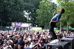De Randamie-grijns, wat hebben we hem gemist. Typhoon rekent terug: 2006 moet het geweest zijn dat hij voor het laatst op Appelsap stond. De Buiten Westen tijd nota bene. "Wie was daar bij? We worden oud, jongens." De grijns zit in de familie. Typhoon wordt vandaag naast door een grote band (inclusief blazers) bijgestaan door zijn boomlange broer O-Dog, die net zo breed glimlacht. Het is de glimlach die zegt dat het goed zit. Typhoon werkte jarenlang aan een rijke, persoonlijke plaat, met teksten over zijn liefdesleven die veel verder gaan dan het poesie-niveau van de meeste anderen. Maar ook met teksten over de multiculturele samenleving en het zoeken naar de God in jezelf. Hij opent zijn set hier met Surfen, een ontroerende song over het ontbreken van lichamelijke liefde in een stervende relatie. Dapper, maar Ty heeft ook genoeg festivalbangers: de razende surfrocker IJswater (over diezelfde relatie, maar dan een fase later), oudje Bumaye en natuurlijk Zandloper. Typhoon is 100% terug.