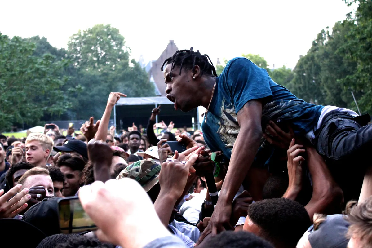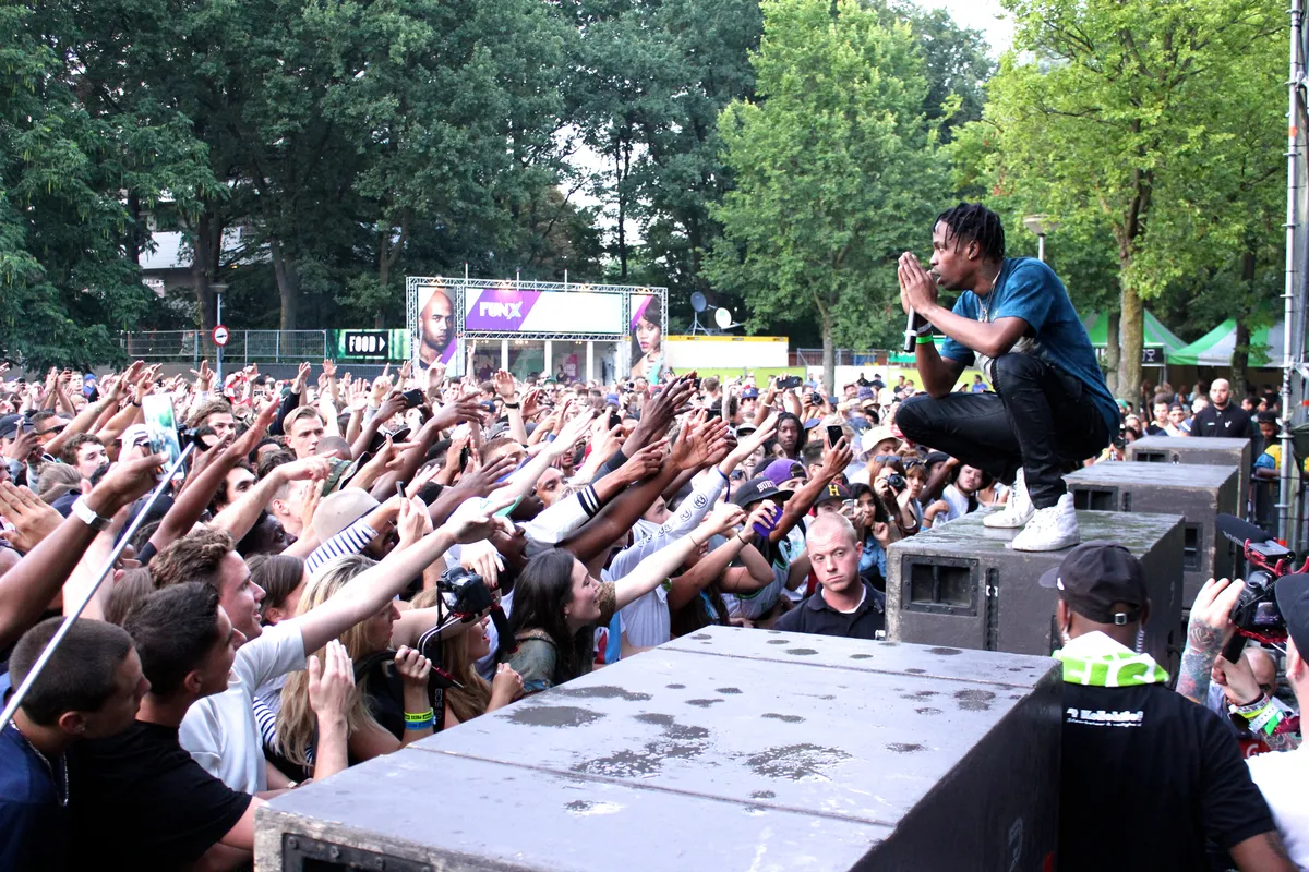 Zijn tijd is allang aangebroken, maar er is iets mis met de techniek. De spanning van het wachten zet Travi$ Scott om in een soort nerveuze energie. Je ziet hem langzaam veranderen in het motherfucking monster dat hij zelf verklaart te zijn. Als het eindelijk zover is klimt hij meteen over het hek, hitst hij zijn publiek op en slaat hij dj Flexican bijna op zijn bek als die het waagt zich nog tijdens zijn optreden klaar te maken om over te nemen. Hij lijkt voortdurend te zoeken, en laat zijn dj de show veel te veel stil leggen, wat eigenlijk eerder tot minder dan tot meer hype leidt. Niet bepaald sympathiek, en toch blijft Scott met zijn gedoe en gejut wel aan de goede kant van de streep. Ieder nummer is een energiebom. Hij klimt in de toren, vraagt om meer en meer water om zijn publiek nat te maken, springt en schreeuwt dat ie één hand op het stuur heeft en de andere op zijn pik. En dan is het tijd voor zijn grootste hit tot nu toe: Upper Echelon, een van de hardste bangers van de laatste tijd. "Pull out the zip, pull out the roll", knalt Scott zijn blow-anthem eruit, natuurlijk met rewind. "We so fucking high, upper echelon."