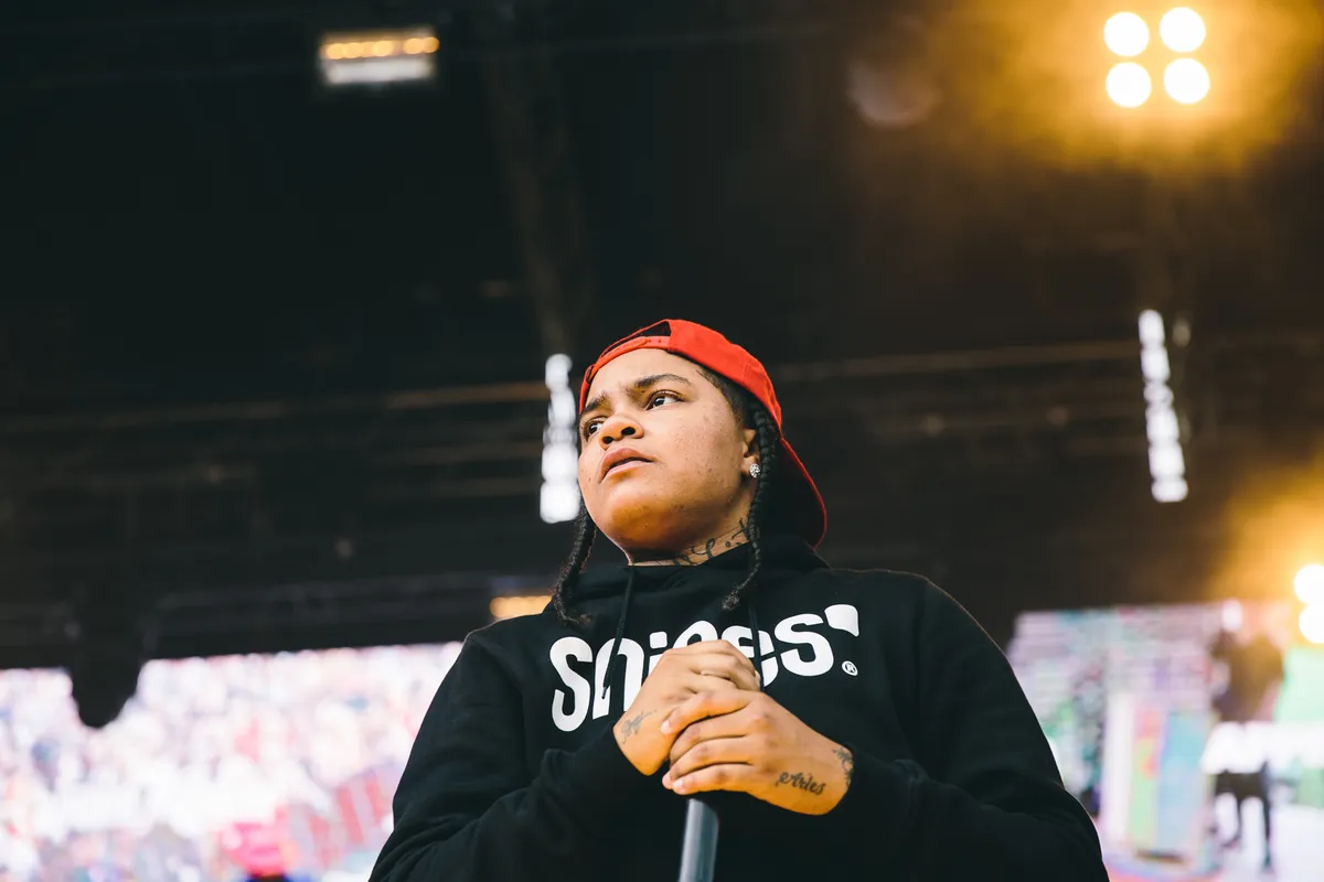 Op het hoofdpodium staat ondertussen Young M.A., de rapper uit Brooklyn met een van de grootste hits van Appelsap 2017 op haar naam: ‘OOOUUU’ (een dikke 125 miljoen streams op Spotify alleen al, en als je geen flauw idee hebt hoe je die songtitel moet uitspreken, heb je het nummer nog nooit gehoord). Ze is een stuk scherper dan laatst op Woo-Hah, en laat haar dj elke keer de beat wegtrekken om a capella haar bars te spitten met die stem van schuurpapier. Het haalt de vaart wel wat uit de show, maar is tegelijkertijd een stoere manier om te laten zien dat ze niet hoeft te leunen op een backing track. Ze is een king en een queen tegelijk, rapt ze, en wie haar teksten luistert valt meteen op hoe openlijk en expliciet ze over haar geaardheid praat. En als dat je niet bevalt? Dan slaat ze je gerust (en terecht) op je bek.