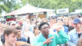 Steevast krijgt ook de UK hiphop een prominente plek op Appelsap. De Londense crew 67 zal vanavond het Noisey-podium nog omver blazen met een grillig en grimey antwoord op Chicago drill, maar eigenlijk is de Gambiaans-Ghanees-Britse J Hus eerder op de dag veel verfrissender, omdat hij zijn grime mixt met lichtvoetige dancehall en afrobeat. Regen of niet, met elke track wordt zijn show dansbaarder, met zijn backup MC en dj doet hij zelfs een ingestudeerd pasje en tijdens ‘Fisherman’ krijgt hij natuurlijk een vissershoedje toegeworpen vanuit het publiek. Zijn gouden tune ‘Did You See’ is net platinum geworden, vertelt hij trots, en ook hier wordt ie onthaald als een HIT. Twee meisjes vooraan reageren hysterisch, en smeken ‘m of ie niet hun mobieltjes wil pakken om een selfie te maken. Helaas, hij lijkt het niet eens te zien.