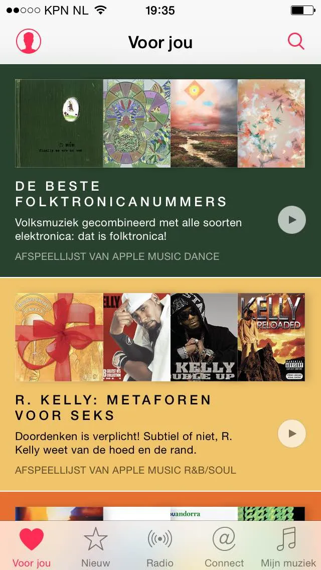 Dan kom je op de thuispagina van Apple Music, de eerste pagina die je voortaan zal zien als je je muziekapp opent. Deze heet ‘Voor jou’, en toont je een aantal afspeellijsten en albums die Apple je aanraadt op basis van je voorkeuren. Bij ons was het een interessante combinatie van playlists met titels als ‘De beste folktronicanummers’ (niet gek), ‘R. Kelly: Metaforen voor seks’ (wellicht vanwege de aangegeven voorkeur voor Usher) en The Good Son van Nick Cave & The Bad Seeds (ook niet verkeerd). Als je iets tegenkomt waar je geen zin in hebt, kun je hier ook de betreffende plaat of playlist lang aanraken en kiezen voor de optie ‘Minder zoals dit aanbevelen’ – toedeloe, Chris Brown!