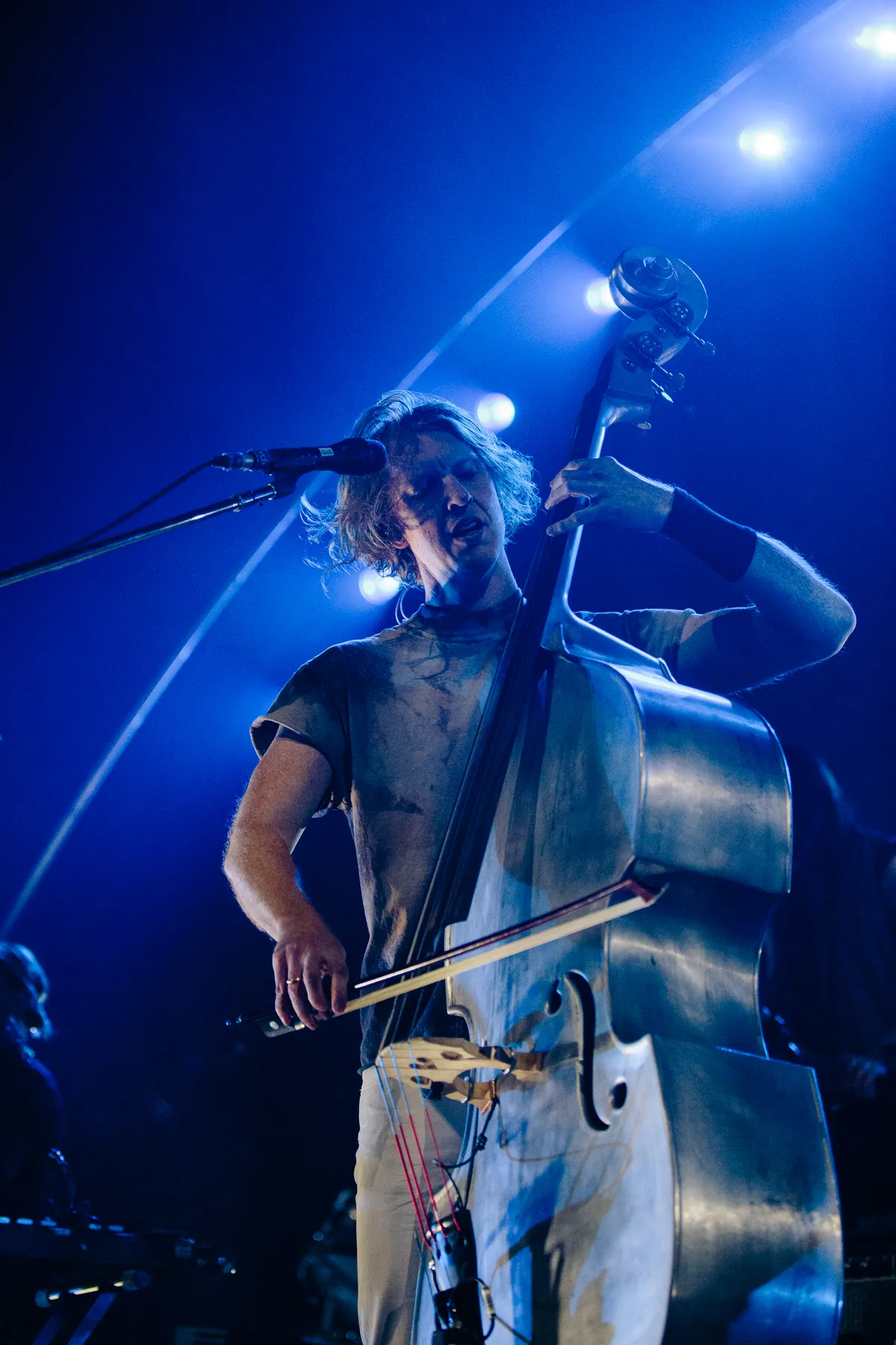 WE, staat er ook groot op de flightcase waar Win Butler telkens weer op gaat staan. Wij tegen de wereld. Wij vormen een front, straalt de band ook uit, die compact in een halve cirkel is opgesteld terwijl achter hen dat alziende oog van het albumartwork prijkt in een gigantisch scherm. De hele show lang zoeken ze heel erg nadrukkelijk de verbinding met het publiek. Vanaf de eerste tel zelfs al. Win en Régine komen op via de fotopit, lopen langs de barriers om alle fans vooraan meteen een handje te geven. Daarna zullen ze niet een, niet twee maar zelfs vier keer dwars door de zaal lopen naar de B-stage achteraan in de Ziggo Dome – met amper security in hun kielzog –, zodat ze hun fans in de ogen kunnen kijken en omgekeerd.
