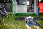 De jongens zijn naar eigen zeggen wat overvallen door het succes van Lowlands Radio. ‘Het was donderdag al zo’n feest dat we al snel te veel hadden gedronken en te weinig hadden geslapen. Toen waren we vrijdag al helemaal stuk en heeft De Beer hier ’s ochtends achter de container nog op een matje liggen slapen. Inmiddels hebben we een vaste verdeling: ik draai ’s ochtends en De Beer in de avond.’