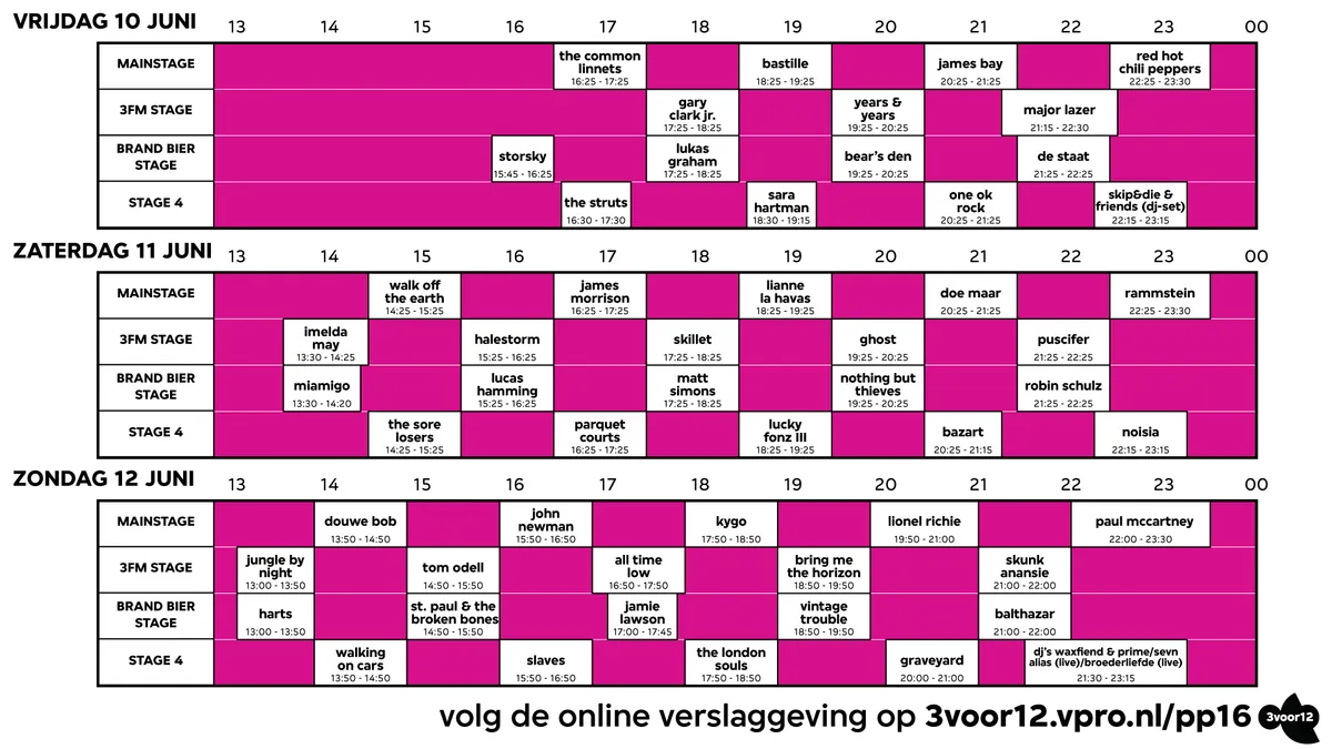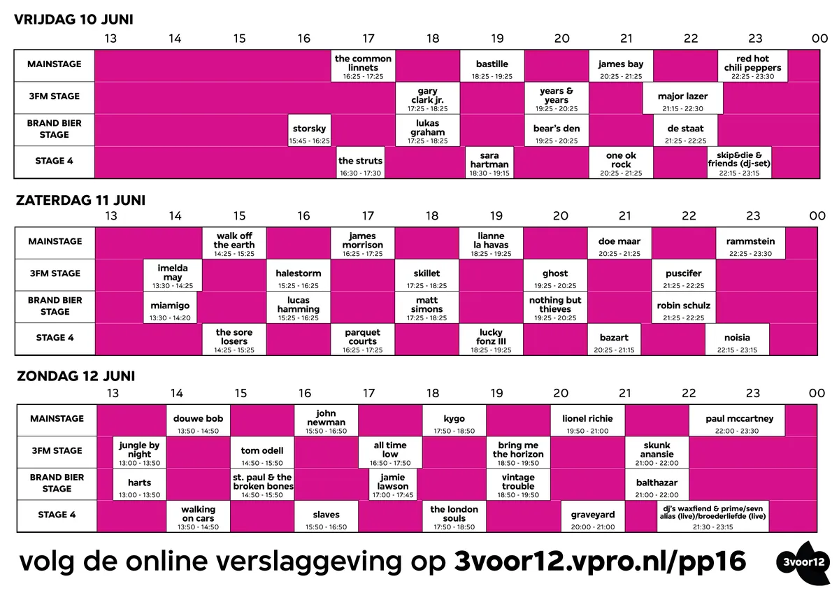 Hooikoorts! Alle tijden van het Pinkpop-programma zijn sinds gisteren bekend. Voordat je zelf begint te knutselen met paint of photoshop heeft 3voor12 het al voor je gedaan. Klik hier voor het blokkenschema en download het meteen voor op je telefoon, zodat je 'm straks op het festival uit je hoofd kent.