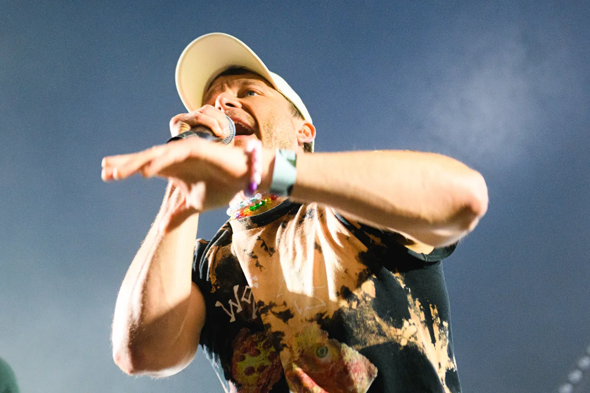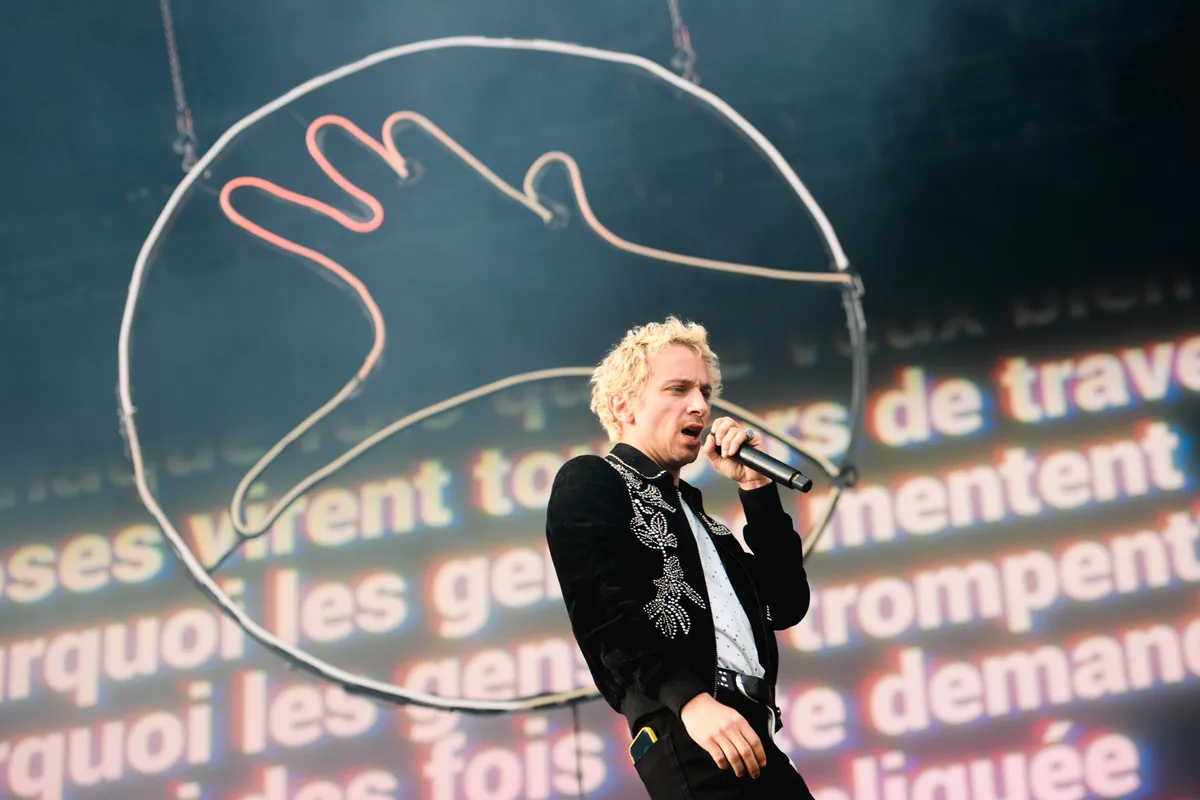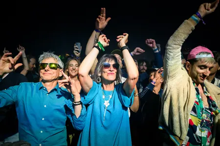 Dury begint ingetogen in zijn fraaie dandypak maar gooit al snel zijn schroom en zijn sjaaltje af. Zijn band blijft redelijk ingetogen spelen, met kitschy Franse koortjes, terwijl Baxter heen en weer springt en cynische teksten spit alsof-ie Mike Skinner is. En hop, nog maar een glas rode wijn. ‘Celebrate me!’ zingt hij. Hij besluit in het volle licht, zwalkend op de track die hij inzong voor Fred Again.. ‘These are my friends…’ Ja hoor Baxter, dat zijn we.