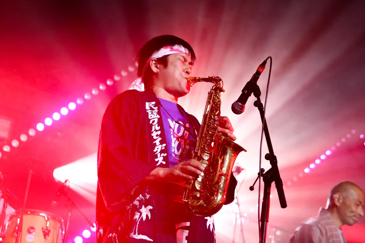 Waar staan we nu in hemelsnaam naar te kijken? Minyo Crusaders, acht Japanners die elk in hun eentje cooler zijn dan jij en je hele vriendengroep bij elkaar. Getooid met schitterende kimono's, maskers, hoofdbanden en zonnebrillen. Kleurrijk als George Clintons Parliament-Funkadelic brengen ze oude Japanse folksongs waar thuis in Tokio niemand meer naar luistert tot leven. Maar omdat écht niemand er naar luistert, weet ook niemand hoe ze klinken. Dus arrangeren de Minyo Crusaders ze met dansbare ritmes uit de hele wereld: reggae, dub, salsa, cumbia, muziek uit de Caraïben tot Afrika.