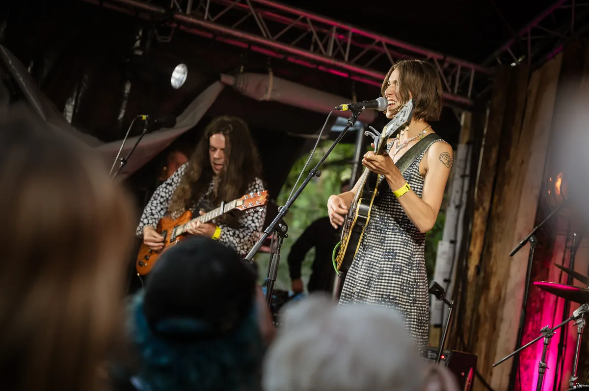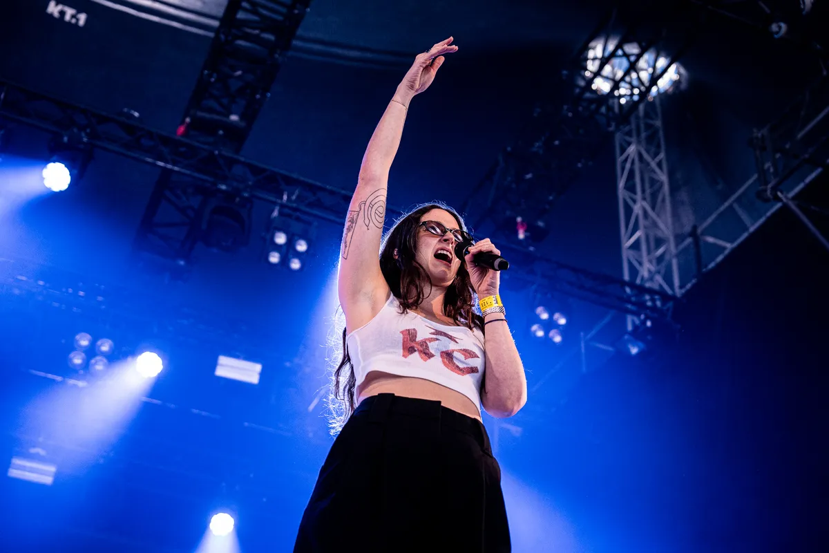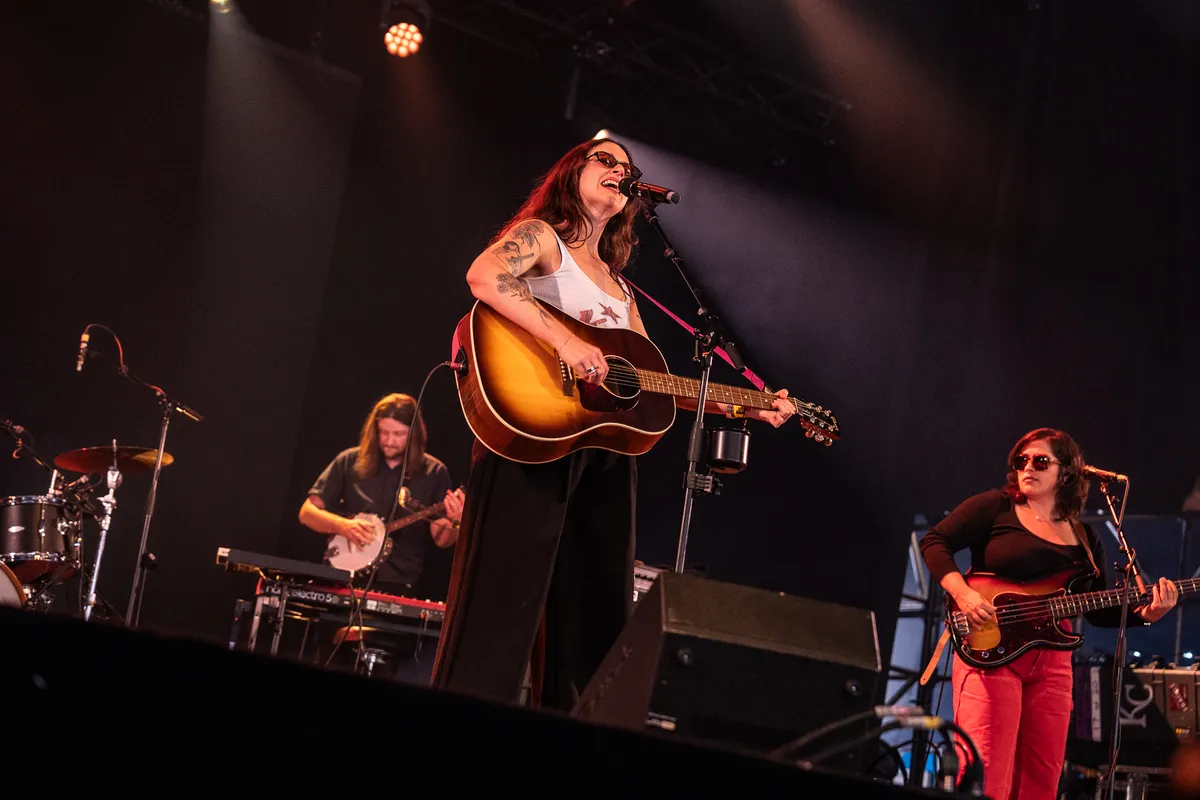 Godsamme wat heeft Waxahatchee toch veel mooie liedjes gemaakt. Vraag het aan haar fans, en Katie Crutchfield uit Alabama speelt in Stage Two LOUTER HITS. Het begint al uitstekend met ‘3 Sisters’, dat lang lekker klein wordt gehouden. Nog veel mooier is ‘Right Back To It’, het duet dat ze met MJ Lenderman opnam. Daar dansen banjo, gitaar en jengelende pedalsteel om elkaar zoals je wil in de betere americana. Die laatste is bepaald geen sad machine, maar een ‘rainbow maker’, zoals op het kartonnen bordje staat: telkens voegt hij kleine kleurrijke versierinkjes toe aan de verder vrij tijdloos gespeelde americana en folkrock. Dat is meteen ook de kritiek die je zou kunnen hebben op Waxahatchee: er zit geen onsje vernieuwingsdrang in, het grootste gedeelte van de set wordt in dezelfde versnelling gespeeld, op 45 kilometer per uur over een landweggetje. Pas in de climax van ‘Tigers Blood’ jakkeren ze opeens in z’n 6 over de snelweg. Om af te sluiten met ‘Fire’. We zeggen het nog maar eens: godsamme, wat een mooie liedjes.