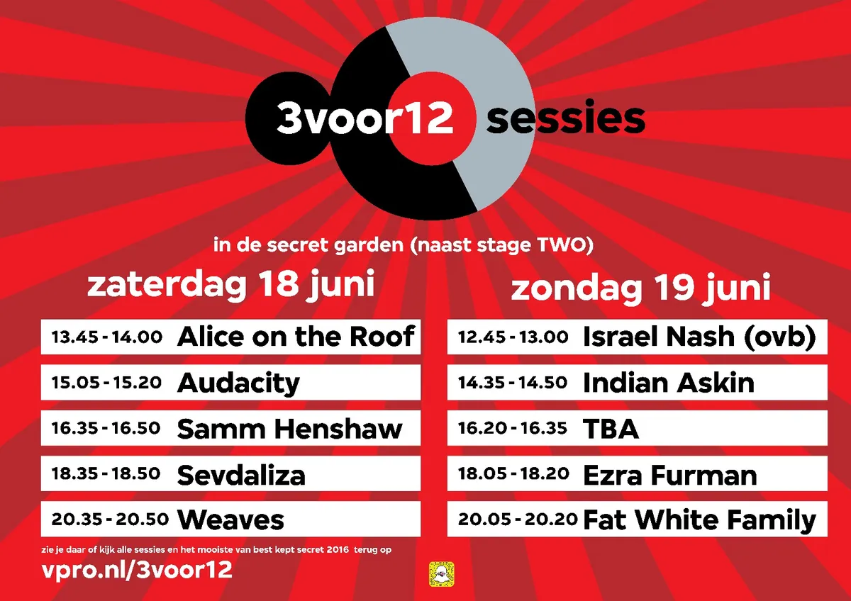 Vanaf vrijdagmiddag kun je de Best Kept Secret livestream bekijken op onze homepage 3voor12.vpro.nl en op NPO 101. Hier is het voorlopige uitzendschema, verwacht continu updates: