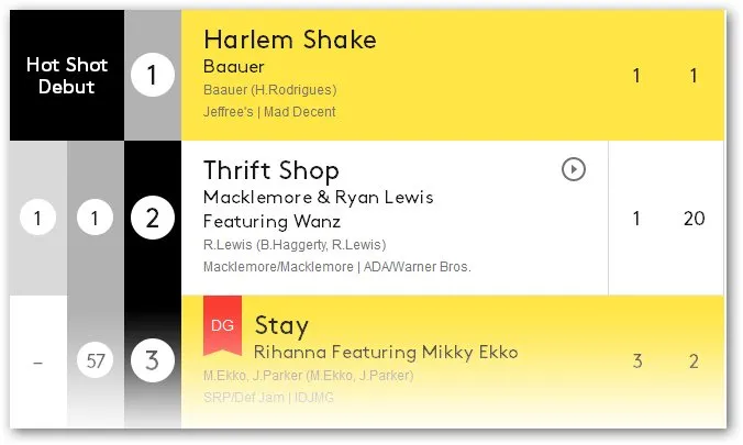 Dat filmpjes van 30 seconden (naar verluidt ligt bij telling de grens op minimaal 20 seconden) meetellen in een lijst die verder alleen audio meet is op z'n zachtst gezegd opmerkelijk. De nieuwe Billboard-formule werpt ook de vraag op in hoeverre je betaalde en gratis plays in één lijst wil vatten. Zo voert Thrift Shop van Macklemore & Ryan Lewis in Amerika wel de lijst van meeste downloads aan (412.000 stuks), maar is die door Baauer naar plaats twee in de Hot 100 verwezen.