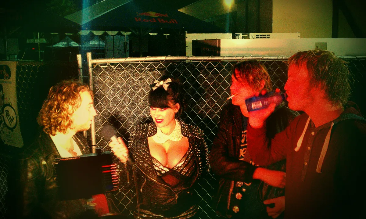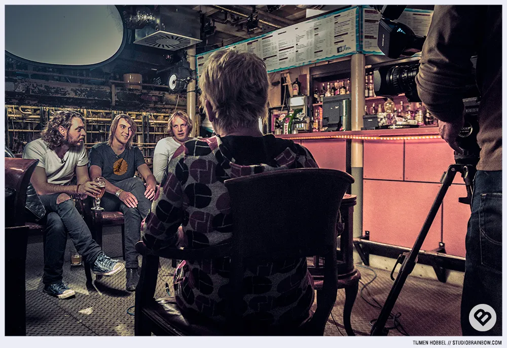 Zelfs in Amerika achtervolgt ons Hollanders de eeuwige klaagzang over het wel of niet racistisch zijn van het woord negerzoen. Toen een ietwat obesi dame aan ons vroeg hoe we het chocolade ding, dat ze in haar mond aan het proppen was, in Nederland noemde en ik het woord negerzoen uit de doeken probeerde te doen, keek ze gepikeerd om zich heen en liep vervolgens weg. Dan niet. Laat het maar aan ons over om Neerlands naam in het buitenland hoog te houden. Als laatste mokerklap met een vuurpijl hadden we na het optreden het meest intrigerende interview ooit. Waarvan hierboven een foto. Intrigerend niet? En niet alleen door de ongelooflijke uiers, slechte vragen en de duidelijk ontbrekende vorm van welke menselijke intelligentie dan ook. Wat niet op de foto te zien is, is nog veel grappiger. Camera en regie waren in de handjes van een dwerg van rond de 1.20 meter, scheel als een dronken bosuil, met jampotglazenbril, een stem om op te schieten en een loopje alsof z'n tampon scheef zit. Sommigen hebben toch ook gewoon de jackpot meteen al binnengeharkt bij de geboorte. De mazzelpik.