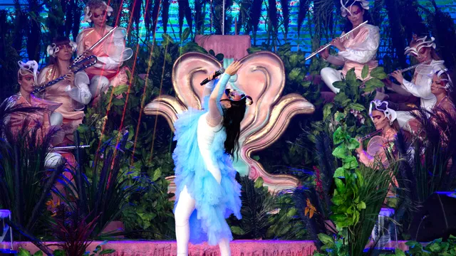 Het is een wonderlijk gezicht, het podium vanavond. Niet alleen vanwege de locatie, maar meer nog door het decor. Het staat volgebouwd met planten, pauwenveren, een enorme gouden bloem rechts, een megabloem links waar later een muzikant in verstopt blijkt te zitten. Nog voor de show begint, wordt uitgelegd wat je precies naar kijkt: niet minder dan Utopia. Het is niet alleen de titel van Björk’s meest recente album, met deze tour visualiseert ze het uitgangspunt van dat album.