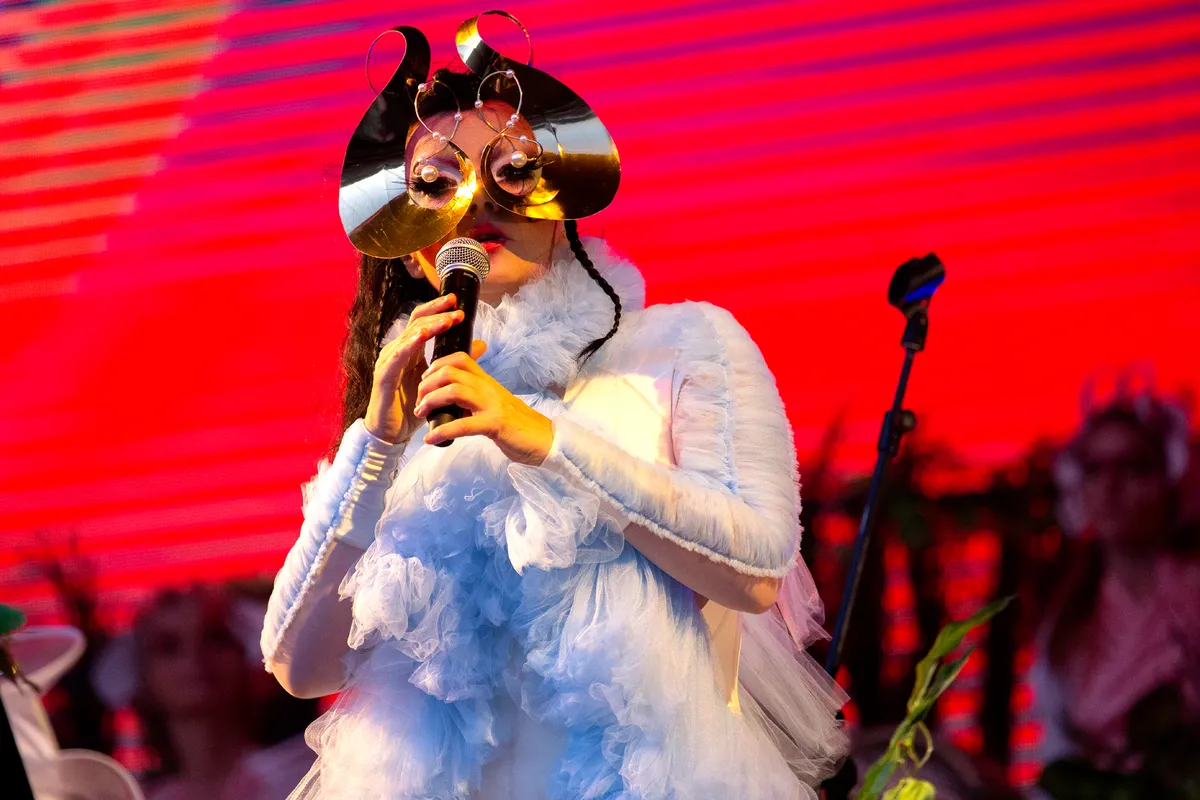 Dat begint met een lichtkrant die over het achterwandvullende LED-scherm schuift: er is een ramp gaande, vertelt die, en we moeten een wereld scheppen die er nog niet is om de huidige te redden. Een wereld waar natuur en techniek hand in hand gaan. Een eiland gevuld met mutanten en onbekende plant- en diersoorten. Op het moment dat het enorme bloemstuk midden op het podium een draaischijf blijkt te zijn, zie je die mutanten: Björk en haar fluitseptet. Zijzelf in een weelderig pak en met een futuristisch gouden bloemenmasker, inclusief stampers die als ogen op stokjes voor haar gezicht bungelen. De blazers met witte maskers, helemaal in glanzend satijn.
