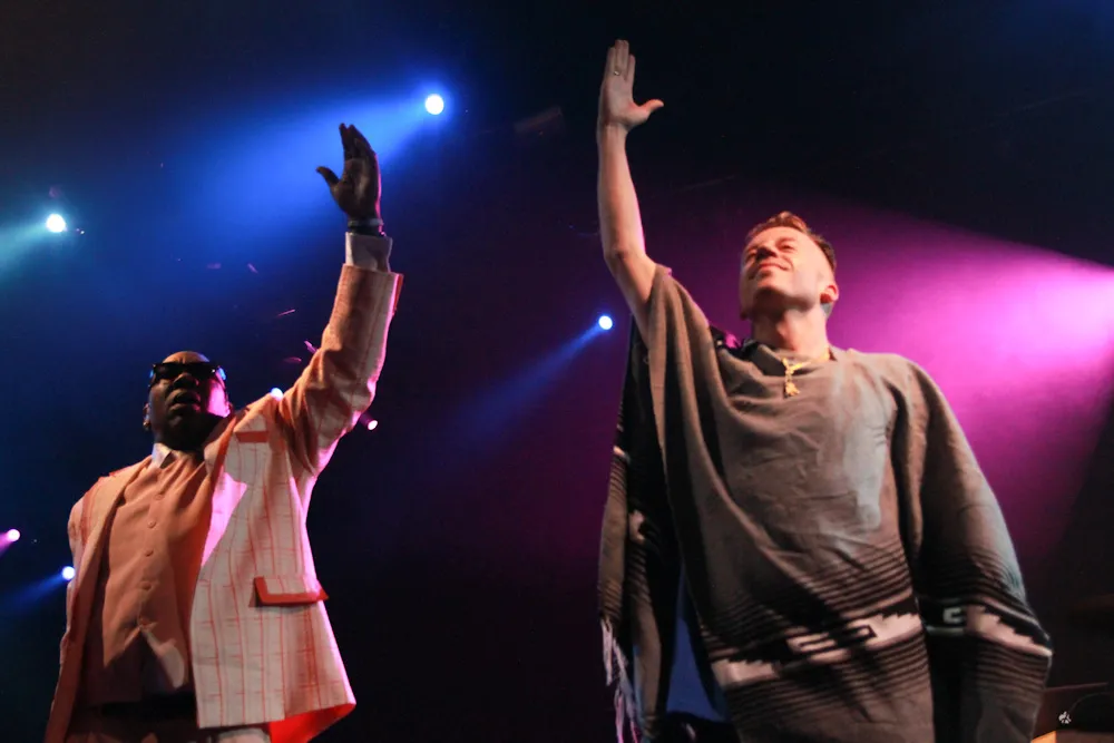 Meteen na het eerste liedje laat Macklemore een opblaassaxfoon naar voren doorgeven. Hij trekt zijn tweedehands kleed nog eens recht. Echt? Nu al? Ja, nu al. This is fucking awesome, gilt de uitpuilende tent hem toe. Meteen daarna volgt het belangrijkste liedje dat hij ooit schreef, vindt hij zelf. Same Love is in elk geval de zwaarst geladen song uit hun oeuvre, een ontroerende ballade over homoseksualiteit, een pijnlijk onderwerp in de hiphopwereld. Macklemore belooft ons de belangrijkste burgerrechtenperiode ooit, waarin gelijkheid dichterbij komt dan ooit. Grote woorden. Het is wel boeiend, zo'n maatschappelijk statement van iemand die bekend staat om frisse party-rap. Ook de andere hit Can't Hold Us horen we al vroeg. Handen omhoog alsof het plafond ons niet kan houden. Ergens klopt die zin niet helemaal, maar wat dondert dat, wat een hit.