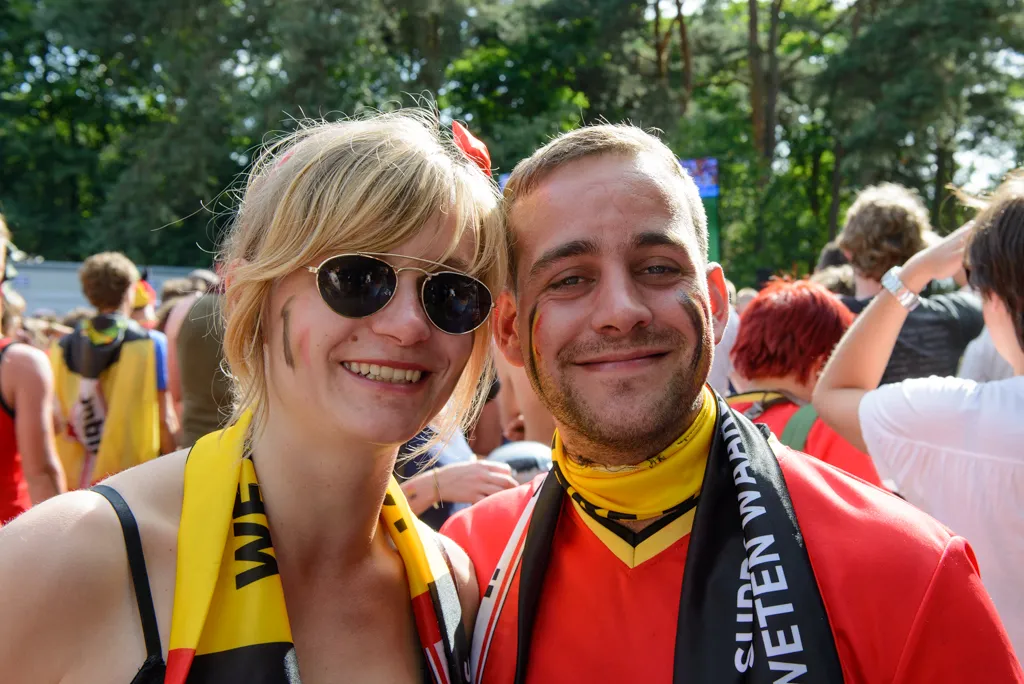 Jens uit Maldegem en Vanity uit Eeklo zitten op een tafeltje in opperste concentratie te kijken. Bij iedere zwieper - Vlaams voor voorzet - staan ze een stukje op, om na een gemiste kans lichtelijk teleurgesteld terug te gaan zitten. Voor hun was het een uitgemaakte zaak: ze zouden en moeten de wedstrijd zien. De enige dealbreaker was Elbow voor Vanity, maar die staan ruim na de wedstrijd te spelen. Of...? Jens: "Als we winnen en het blijft gezellig, dan kunnen we nog wel even blijven." En die winst, die gaat er volgens Jens komen: "Het wordt 3-1."